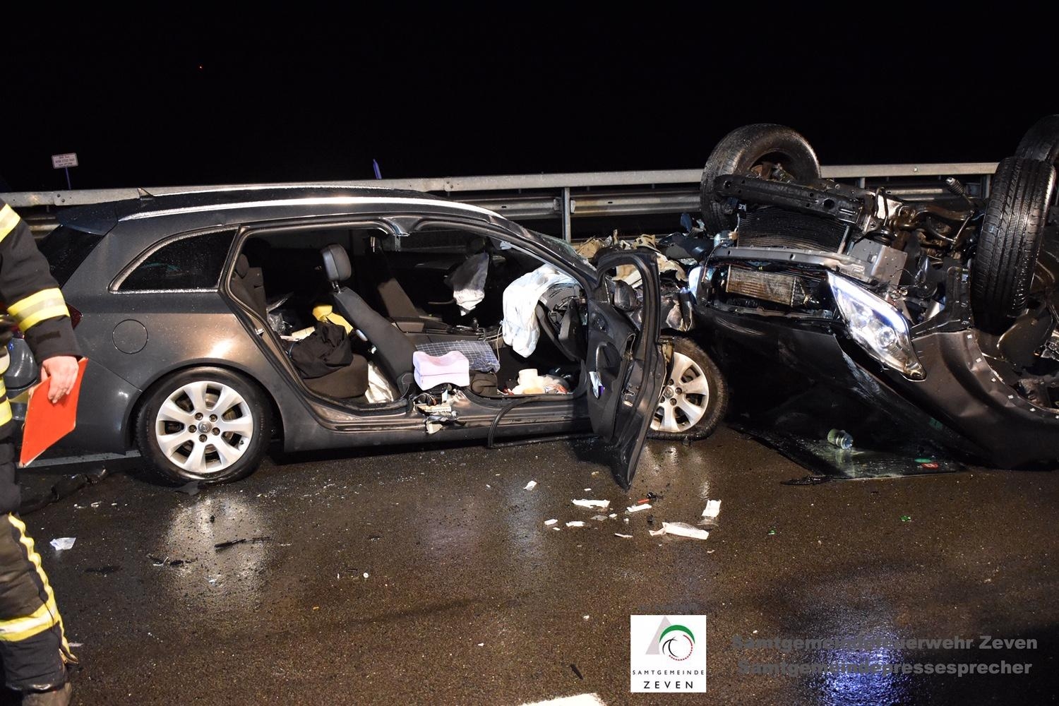 Elsdorf (tg) Am 11.03.2019 gegen 2:10 Uhr kam es auf der Autobahn A1 Fahrtrichtung Bremen, zwischen den Anschlussstellen Elsdorf und Bockel zu einem Verkehrsunfall mit mehreren beteiligten Fahrzeugen, bei denen noch mehrere Personen eingeklemmt sein sollen.  Daraufhin wurden von der Leitstelle in Zeven die Ortsfeuerwehren Gyhum, Elsdorf, Zeven und der Rettungsdienst alarmiert. Den erst eintreffenden Kräften stellte sich folgende Lage dar. Ein PKW lag an der Mittelleitplanke auf dem Dach, ein weiterer PKW stand direkt an dem auf dem Dach liegenden PKW, ein Person lag auf dem Standstreifen vor einem weiteren PKW. Der Fahrer des auf dem Dach liegenden PKW war nicht in seinem massiv zerstörten PKW eingeklemmt und konnte so gerettet werden. Der Fahrer und die Beifahrerin aus dem zweiten PKW mussten befreit werden. Hierzu wurde nach Rücksprache mit dem Rettungsdienst eine große Öffnung auf der Beifahrerseite geschaffen. Nach entfernen der Tür und der B-Säule konnten die zwei Personen schonend gerettet werden. Alle drei Verletzten wurden an den Rettungsdienst übergeben. Sie wurden nach Erstversorgung in Krankenhäuser in Rotenburg, Bremen und Hamburg eingeliefert. Für die Person auf dem Standstreifen kam leider jede Hilfe zu spät, sie verstarb noch an der Unfallstelle.Da die Lage doch sehr übersichtlich war, konnten schon schnell die ersten Kräfte aus dem Einsatz entlassen werden und an ihren Standort zurückkehren. Die Ortsfeuerwehr Gyhum blieb noch bis Abschluss der technischen Rettung an der Einsatzstelle. Für die Unfallaufnahme und das Ausleuchten der Einsatzstelle blieb die Ortsfeuerwehr Elsdorf mit einem Teil der eingesetzten Kameraden vor Ort. Gegen 5:10 konnten auch diese Kräfte die Einsatzstelle wieder verlassen.Im Einsatz waren etwa 50 Einsatzkräfte von Feuerwehr mit 7 Fahrzeugen, 5 Rettungswagen, 3 Notarzteinsatzfahrzeuge, der OrgL Rettungsdienst und die Autobahnpolizei mit 3 Fahrzeugen.