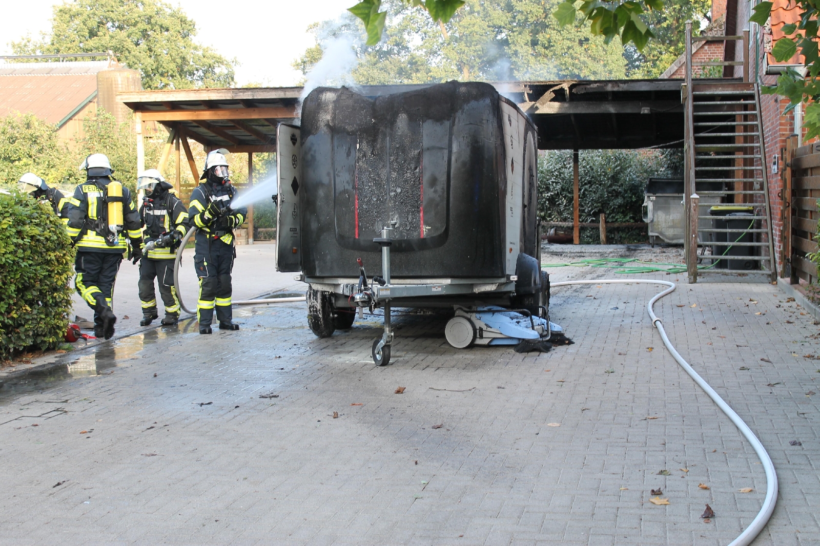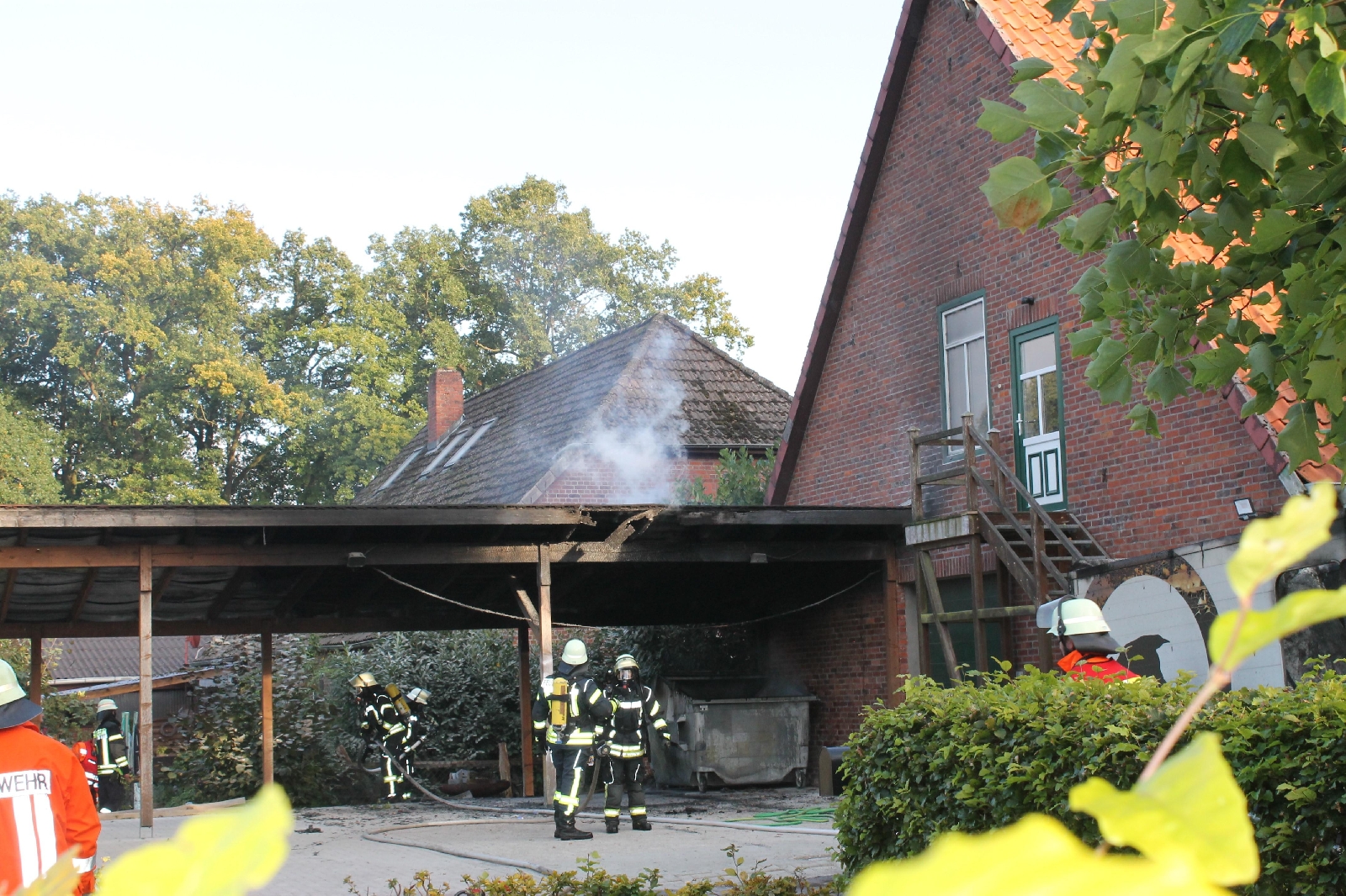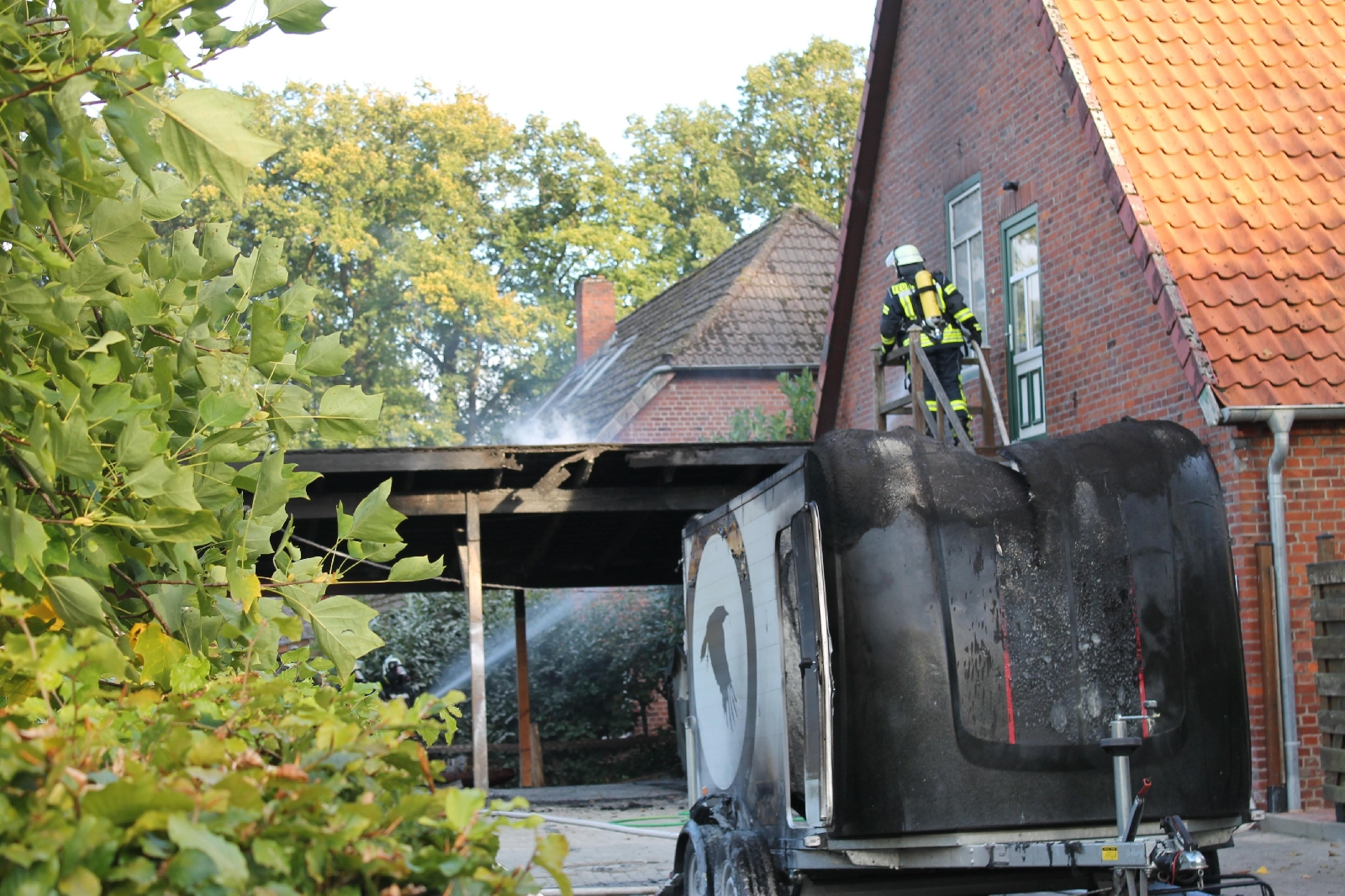 Brennt CarportGranstedt. Am Montagnachmittag gegen 17 Uhr ging es erneut zu einem Feuer nach Granstedt in die dortigen Granstedter Dorfstraße, hier stand aus unerklärlichen Gründen ein Anhänger sowie Teile des Carports in Flammen, diese drohten auf das angrenzende Wohnhaus überzugreifen. Nachbarn und Anwohner hatten bereits erste Löschversuche mit Feuerlöschern vorgenommen und den Anhänger ins freie gezogen. Das Feuer war nach dem Beginn der Löschmaßnahmen schnell unter Kontrolle und kurze Zeit später auch gelöscht. Aufgrund des schnellen Handels konnte das Wohnhaus gerettet werden.