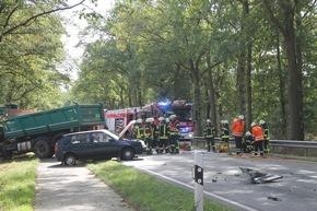 Am Freitagmittag kam es gegen 13 Uhr zu einem schweren Verkehrsunfall auf der B71 zwischen Deinstedt Bahnhof und Bevern. An diesem Unfall waren ein Lkw der mit Sand beladen war, ein Kleintransporter und drei Pkw beteiligt.Aus ungeklärter Ursache ist eine Kia-Fahrerin auf die Gegenfahrbahn geraten und mit einem entgegen kommenden Lkw zusammengestoßen. Dieser kam nach rechts von der Fahrbahn ab touchierte eine Leitplanke und prallte danach auf der linken Seite gegen einen Baum. Vorher kollidierte er noch mit einem VW Golf. Der Kia kollidierte zudem noch mit einem Kleintransporter und einem Opel.