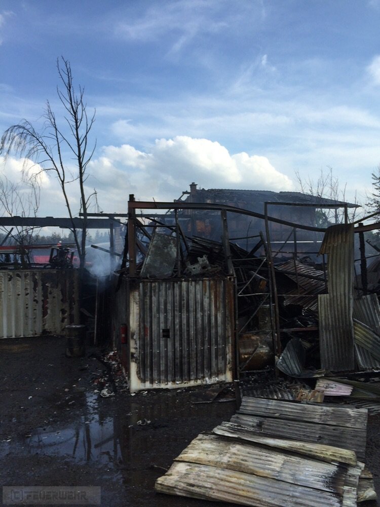 Eine weitere Gefahr zu dem Feuer war, es befand sich ein Gastank, ein Diesel Tank und mehrere Gasflaschen in den Containern. Diese führte immer wieder zu Verpuffungen und die Kräfte mussten sich zurückziehen. Das angrenzende Wohnhaus an der Lagerhalle wurde sehr stark in Mitleidenschaft gezogen. Ein Übergreifen auf weitere Gebäude konnte durch das zügige eingreifen der Brandschützer verhindert werden.