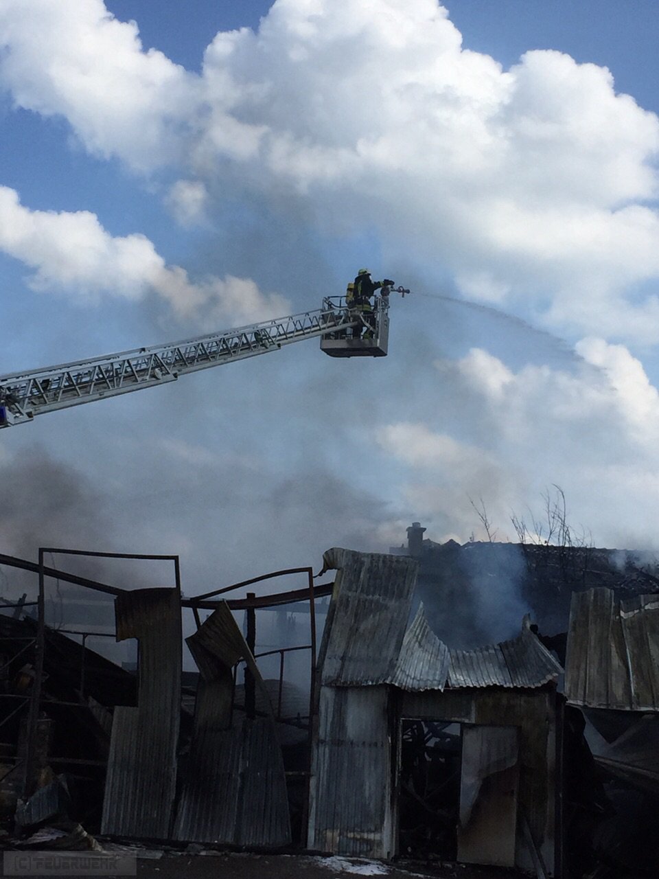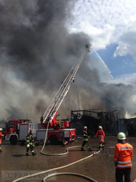 Das Löschwasser kam aus mehreren Hydranten und einem Regenrückhaltebecken aus der Umgebung. Die Wärme machte den Brandschützern sehr zu schaffen, zwei Feuerwehrleute mussten vorsorglich ins Krankenhaus eingeliefert werden. Um 17.39 Uhr wurde „Feuer aus" gemeldet. Die Nachlöscharbeiten zogen sich bis in die Nacht hin. Mit mehreren Baggern wurden die Lagerhalle und die Container auseinandergezogen, um auch die restlichen Glutnester abzulöschen.