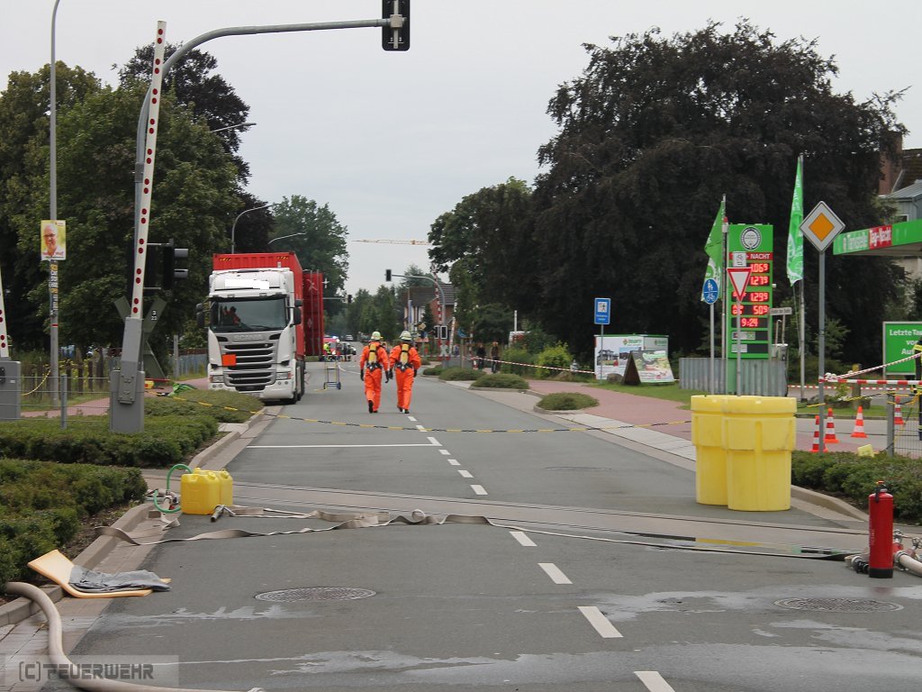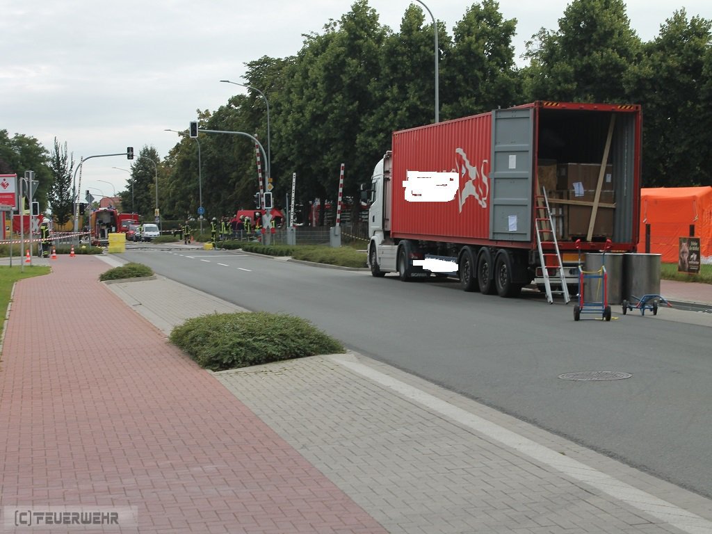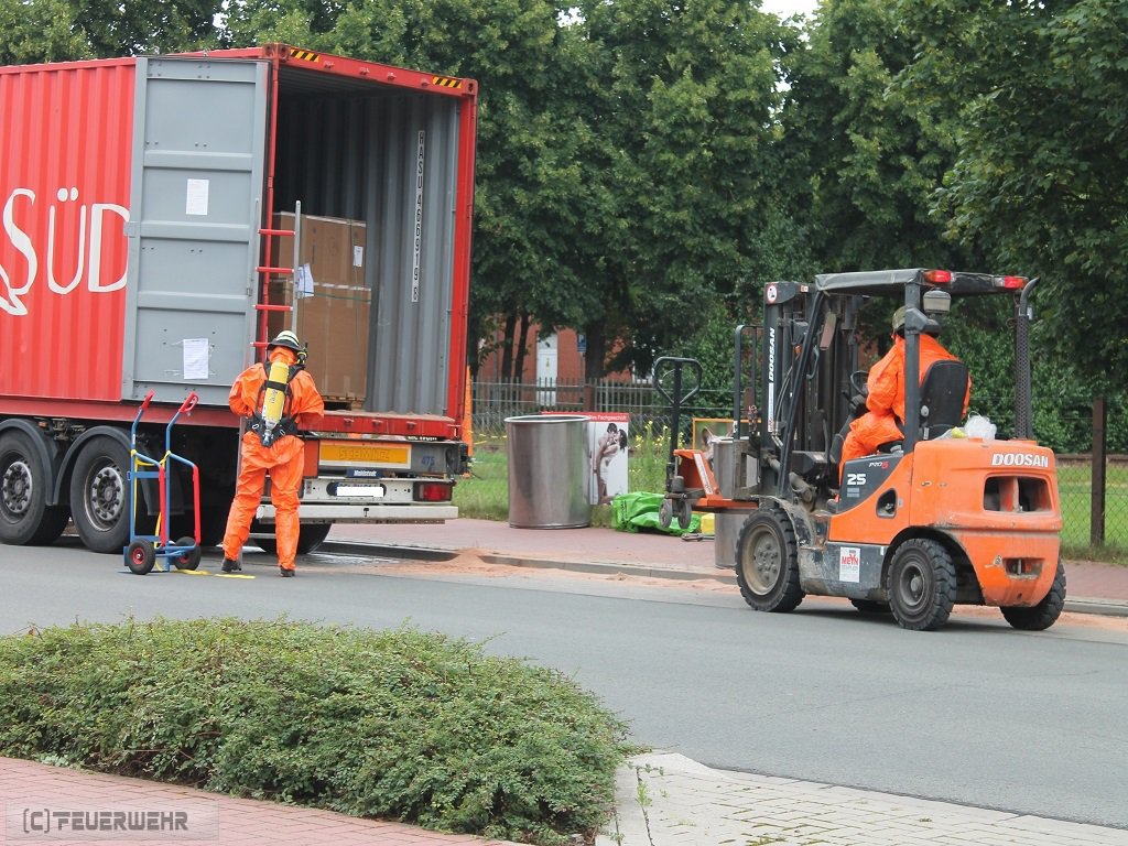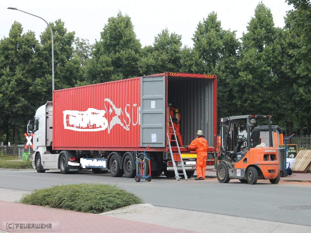 Zeven, 11.08.2016 (PK) In den frühen Morgenstunden des 11.08.2016 wurde die Feuerwehr Zeven sowie der Gefahrgut- und Umweltschutzzug des Landkreises gegen 6.00 Uhr zu einem Gefahrgutaustritt aus einem 40 Fuß Container alarmiert. Ein LKW Fahrer hatte eine offensichtliche Leckage an seiner Fracht entdeckt, woraufhin eine zunächst undefinierte Substanz aus dem Container des Gespanns ausgetreten ist. Da der LKW als Gefahrguttransport gekennzeichnet war, wurde der umliegende Bereich direkt abgesperrt und das in unmittelbarer Nähe befindliche Gymnasium sowie die Berufsschule geschlossen. Der Unterricht viel an diesem Tag für alle Klassen aus. Die Bahnhofstr. wurde für den Verkehr in beide Fahrtrichtungen voll gesperrt.