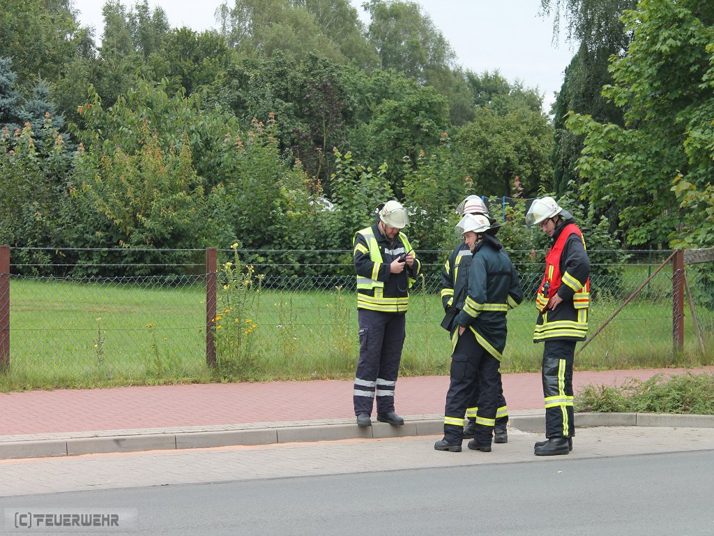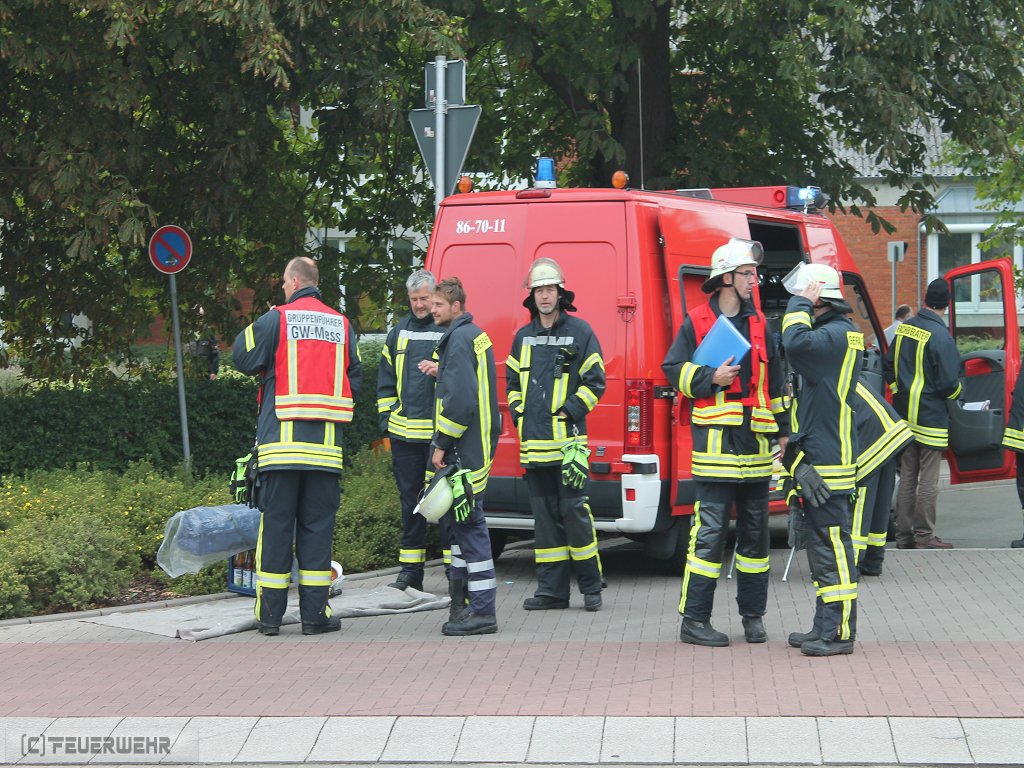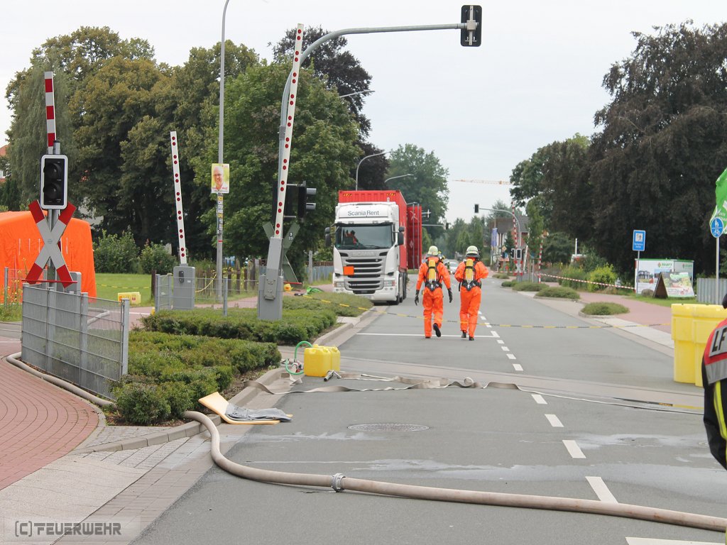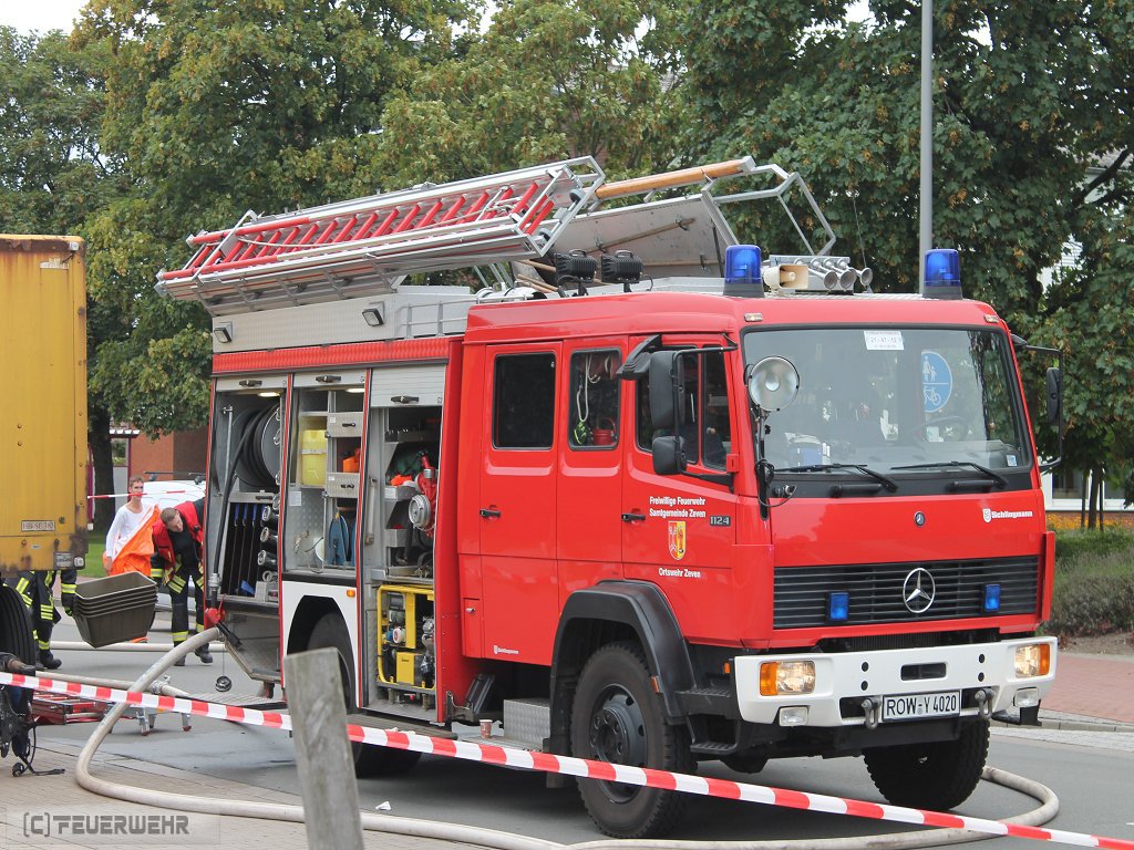 Zeven, 11.08.2016 (PK) In den frühen Morgenstunden des 11.08.2016 wurde die Feuerwehr Zeven sowie der Gefahrgut- und Umweltschutzzug des Landkreises gegen 6.00 Uhr zu einem Gefahrgutaustritt aus einem 40 Fuß Container alarmiert. Ein LKW Fahrer hatte eine offensichtliche Leckage an seiner Fracht entdeckt, woraufhin eine zunächst undefinierte Substanz aus dem Container des Gespanns ausgetreten ist. Da der LKW als Gefahrguttransport gekennzeichnet war, wurde der umliegende Bereich direkt abgesperrt und das in unmittelbarer Nähe befindliche Gymnasium sowie die Berufsschule geschlossen. Der Unterricht viel an diesem Tag für alle Klassen aus. Die Bahnhofstr. wurde für den Verkehr in beide Fahrtrichtungen voll gesperrt.
