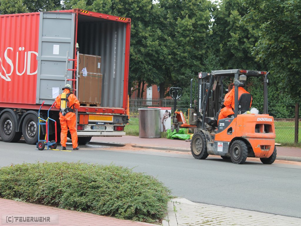 Nach intensiven Messungen und Erkundungen konnte eine massive Gefährdung ausgeschlossen werden. Unter Chemikalienschutzanzügen der Form II sowie Atemschutz wurde der Container schließlich durch die Feuerwehr entleert um an die Leck geschlagene Fracht zu gelangen. Da das Stückgut teilweise ein enormes Eigengewicht hatte, wurde durch ein nahe gelegenes Unternehmen ein Flurförderfahrzeug zur Verfügung gestellt. Alle Frachtstücke sind anschließend in einer Halle für den abschließenden Abtransport zwischen gelagert worden. Bereits ausgelaufene Stoffe wurden mit Bindemittel aufgenommen.