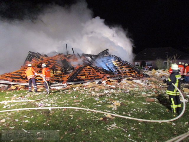 Alarmiert wurden die Feuerwehren Kalbe, Sittensen, Tiste, Lengenbostel, Klein Meckelsen, Freetz, Wohnste und Zeven sowie der Gefahrgutzug des Landkreises Rotenburg (Wümme). Beim Eintreffen der ersten Wehren bot sich den Einsatzkräften ein Trümmerfeld. Das Wohnhaus stand bereits in Vollbrand. Anfangs wurde ein Bewohner vermisst. Leider konnte er später nur noch Tod aus den Trümmern geborgen werden.