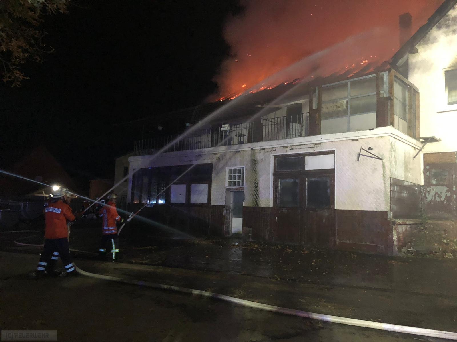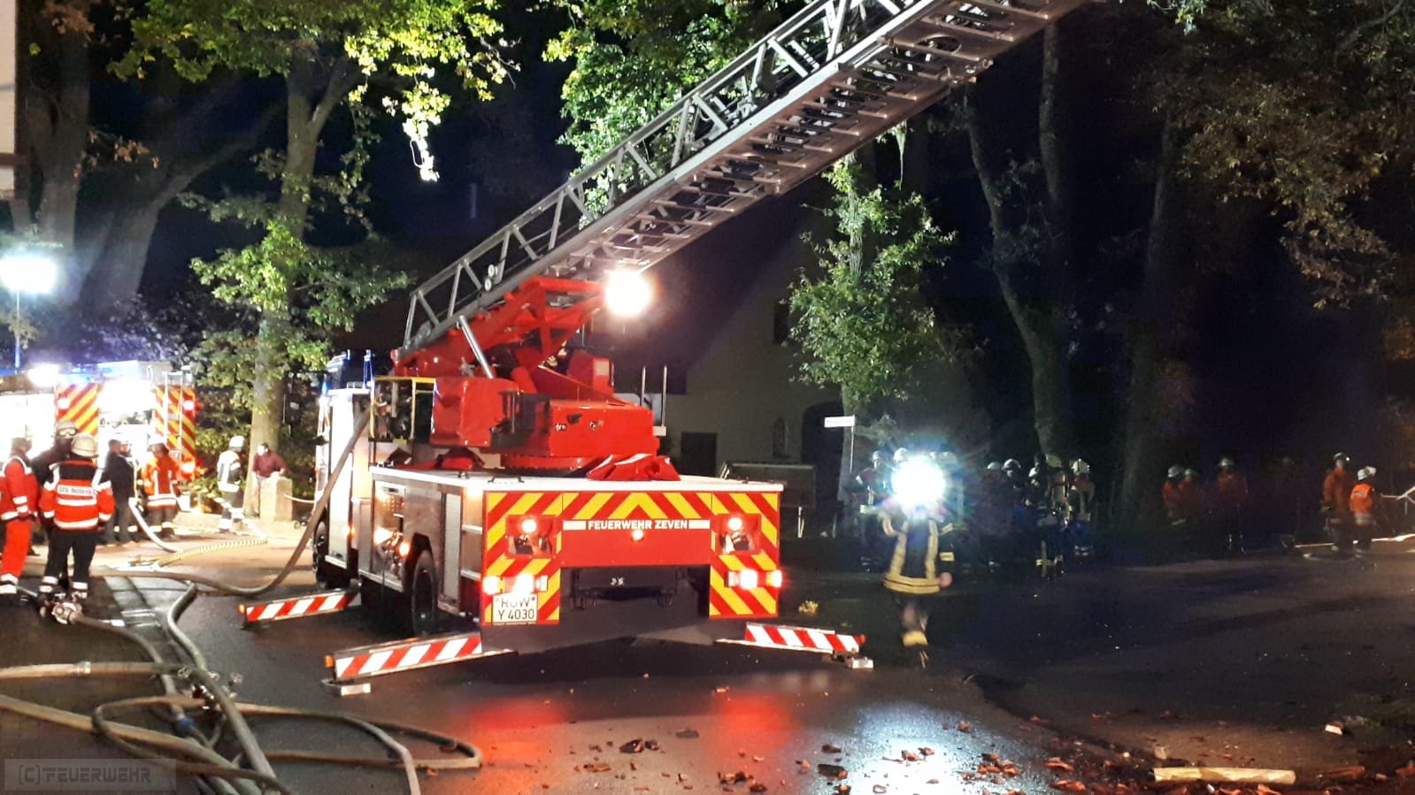 Zur Brandbekämpfung wurden mehrere B- und C-Rohre an verschiedenen Seiten des Gebäudes eingesetzt. Von der Drehleiter Zeven kam ein Wenderohr zum Einsatz. Die angrenzenden Gebäude konnten durch sogenannte Riegelstellungen vor den Flammen geschützt werden. Dadurch konnte ein Übergreifen der Flammen auf die Gebäude verhindert werden.Nach etwas über einer Stunde konnte „Feuer unter Kontrolle“ gemeldet werden. Die Nachlöscharbeiten waren gegen 2:00 Uhr beendet. Ein Brandsicherheitswache blieb noch vor Ort.Menschen und Tiere kamen nicht zu Schaden.Zur Schadenshöhe und Ursache können von Seiten der Feuerwehr keine Angaben gemacht werden.