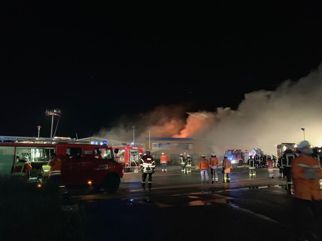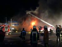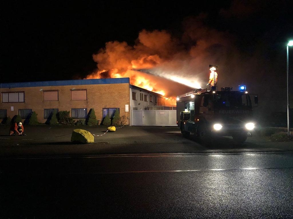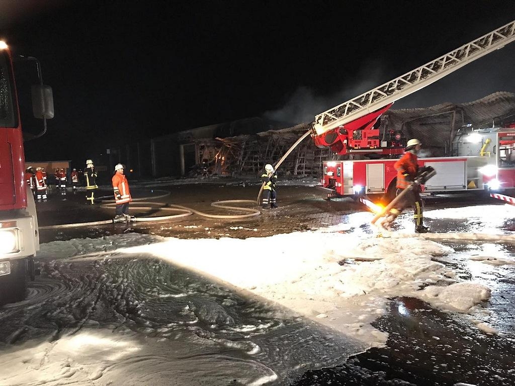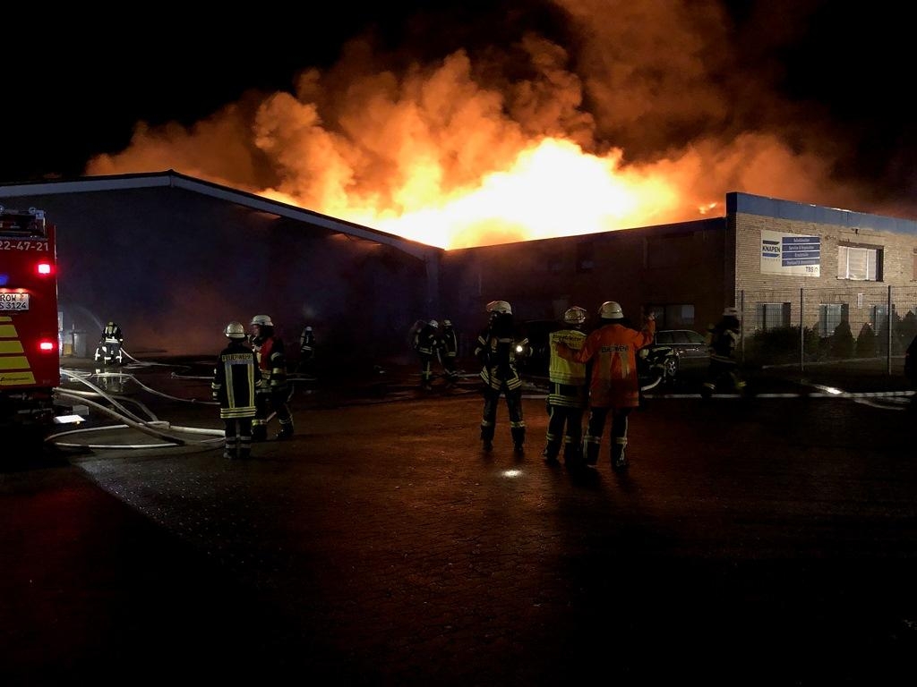 10.12.2018 Sittensen (as). Ein Großaufgebot an Feuerwehrkräften musste am Montagabend gegen kurz vor 20 Uhr nach Sittensen in den Heidornweg ausrücken. Eine rund einhundert Meter lange Werkstatthalle mit vorgelagertem Bürotrakt brannte aus unbekannter Ursache.