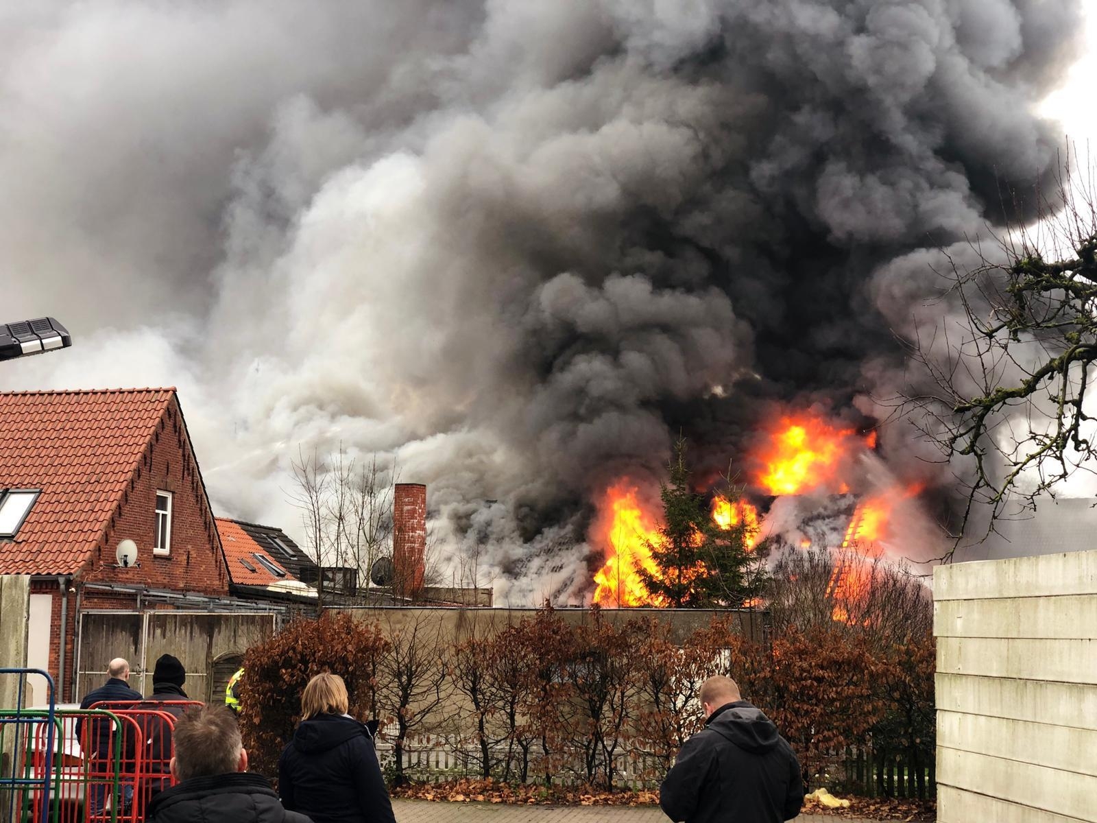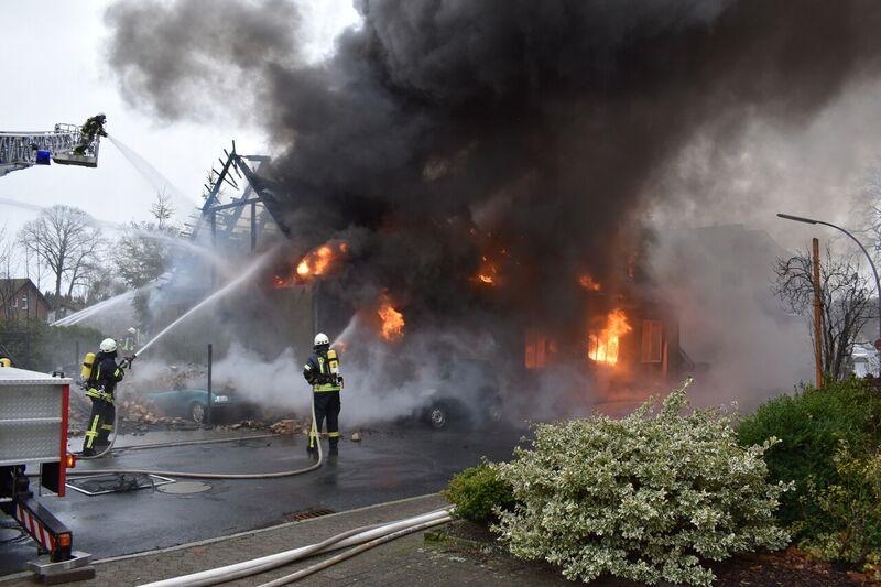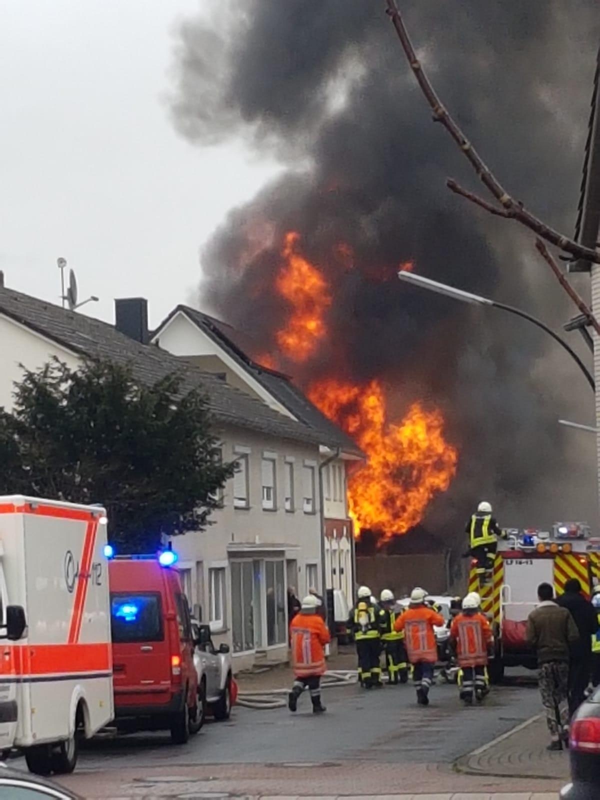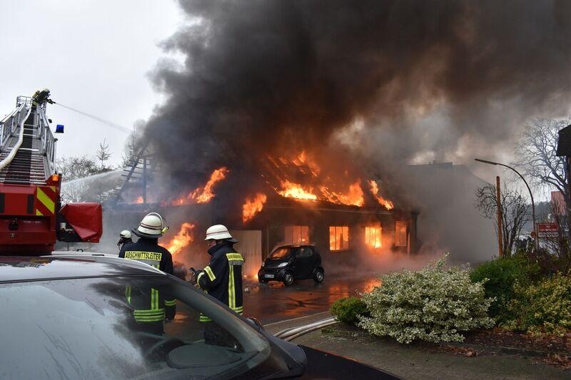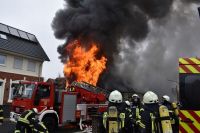 Ein ca. 8 x 15m großes Werkstattgebäude in Massivbauweise brannte im Erdgeschoss in voller Ausdehnung, die Flammen griffen schon über die hölzernen Zwischendecke auf das Dach über. Angrenzende Gebäude waren aufgrund der engen Bebauung in dem Bereich akut gefährdet. Ein Innenangriff war zu diesem Zeitpunkt nicht mehr möglich. Eine Person, die in der Werkstatt gearbeitet hatte, konnte sich vor eintreffen der Feuerwehr selber in Sicherheit bringen.Durch die Besatzung des LF 20 wurde umgehend eine Brandbekämpfung und eine Riegelstellung zum Nachbargebäude vorgenommen. Weitere Trupps gingen von der Gebäuderückseite zur Brandbekämpfung vor. Zur Absicherung der Nachbargebäude wurden von verschiedenen Stellen an Vorder- und Rückseiten Trupps mit C-Strahlrohren eingesetzt. Zeitweise waren 6 C-Rohre, 2 B-Rohre und das Wenderohr von der Drehleiter im Einsatz. Die Wasserversorgung dafür wurde aus umliegenden Hydranten sicher gestellt.Nach ca. 20 Minuten stürzte der eine Giebel des Gebäudes ein und es kam zu einer massiven Flammen- und Hitzestrahlung, die eines der Nachbargebäude bedrohte. Ein übergreifen der Flammen auf dieses Gebäude konnte aber erfolgreich verhindert werden. Lediglich einige Fensterscheiben an der Hausseite sind durch die Hitze gesprungen bzw. beschädigt worden.Zwischenzeitlich wurde die Alarmstufe auf „Feuer 4“ erhöht, um genügend Atemschutzgeräteträger an der Einsatzstelle zur Verfügung zu haben. Von der Feuerwehrtechnische Zentrale in Zeven kam der Gerätewagen Atemschutz mit Ersatzflachen an die Einsatzstelle.Erste Löscherfolge zeigten sich nach etwas über einer halben Stunde, das Feuer unter Kontrolle war nach etwa einer Stunde. Das Gebäude wurde im Anschluss von der Drehleiter aus mit Löschschaum abgelöscht um dem Feuer den Sauerstoff zu entziehen und die letzten Glutnester zu ersticken.Durch eine ortsansässige Baufirma wurde ein Bagger zur Verfügung gestellt um das einsturzgefährdete Gebäude einzureissen. Im Anschluss wurden noch die letzten Glutnester aufgesucht und abgelöscht.Im Anschluss wurde die Einsatzstelle noch einmal kontrolliert und an die Polizei übergeben.Einsatzende nach sämtlichen Aufräumarbeiten und herstellen der Einsatzbereitschaft war ca. 17.30 Uhr Im Einsatz waren ca. 120 Einsatzkräfte von Feuerwehr, DRK und Polizei.