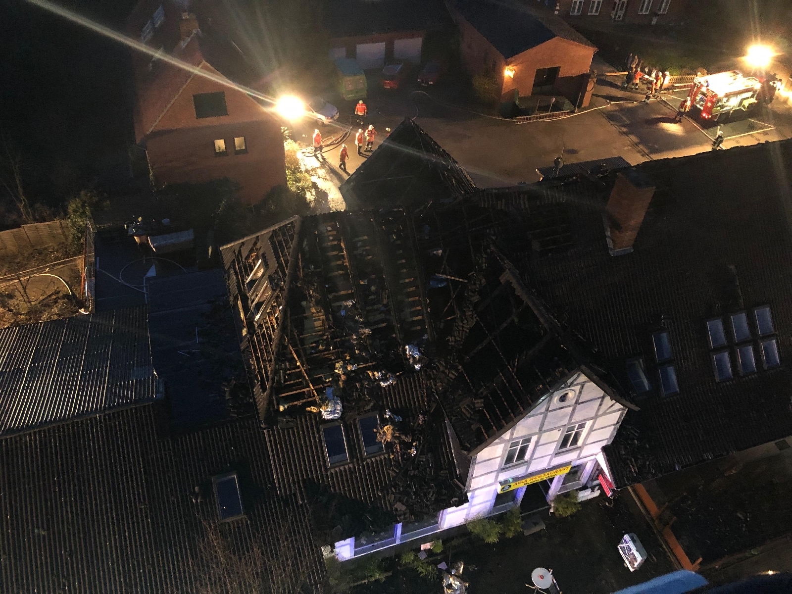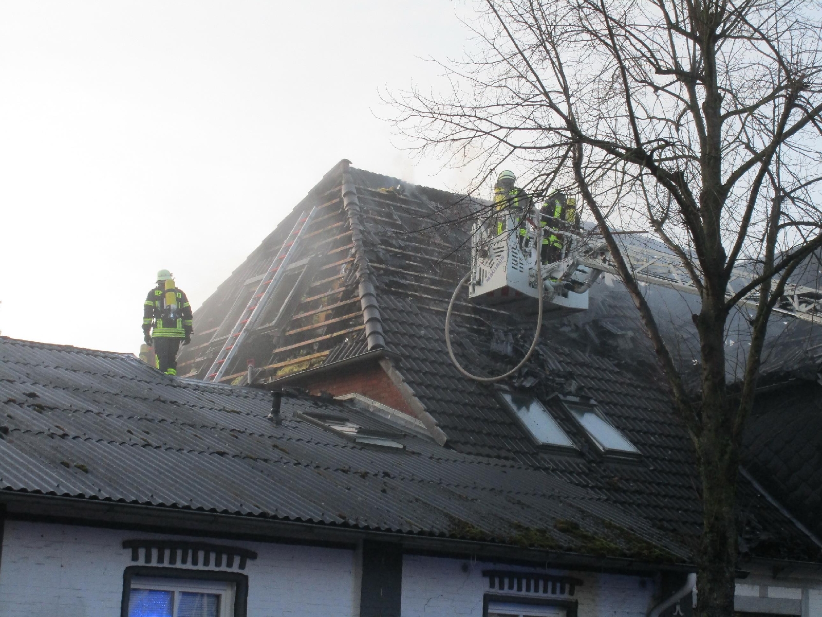 Bei Eintreffen der Feuerwehren unter Leitung von Ortsbrandmeister Jürgen Stache wurde umgehend das Alarmstichwort erhöht, da bereits Flammen aus dem Dachstuhl schlugen. Parallel gingen Trupps unter Atemschutz zur Brandbekämpfung in den Innenangriff. Mit mehreren C- und B-Rohren wurde ein massiver Außenangriff gestartet. Zwei Drehleitern löschten mit ihrem Wenderohren den Brand von oben. Die Schwierigkeit war, dass die Dachpfannen einzeln entfernt werden, mussten, um an die Flammen im Dachstuhl heranzukommen. Um ausreichend Löschwasser an die Einsatzstelle zu bekommen, musste eine Wasserversorgung zu mehren Hydranten und zum nahe gelegenen Mühlenteich hergestellt werden.