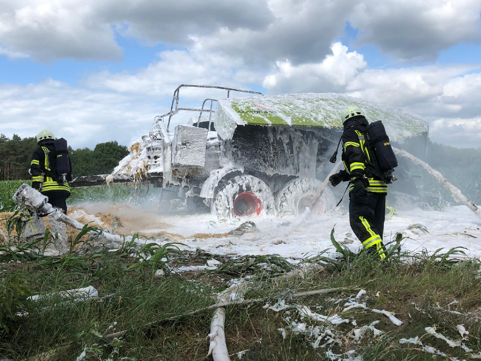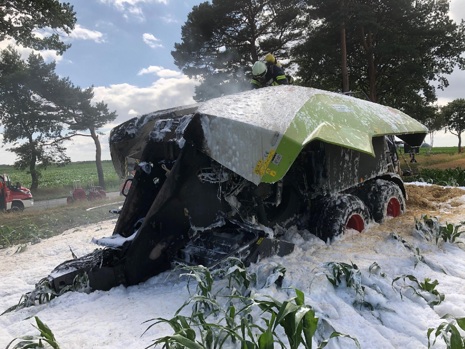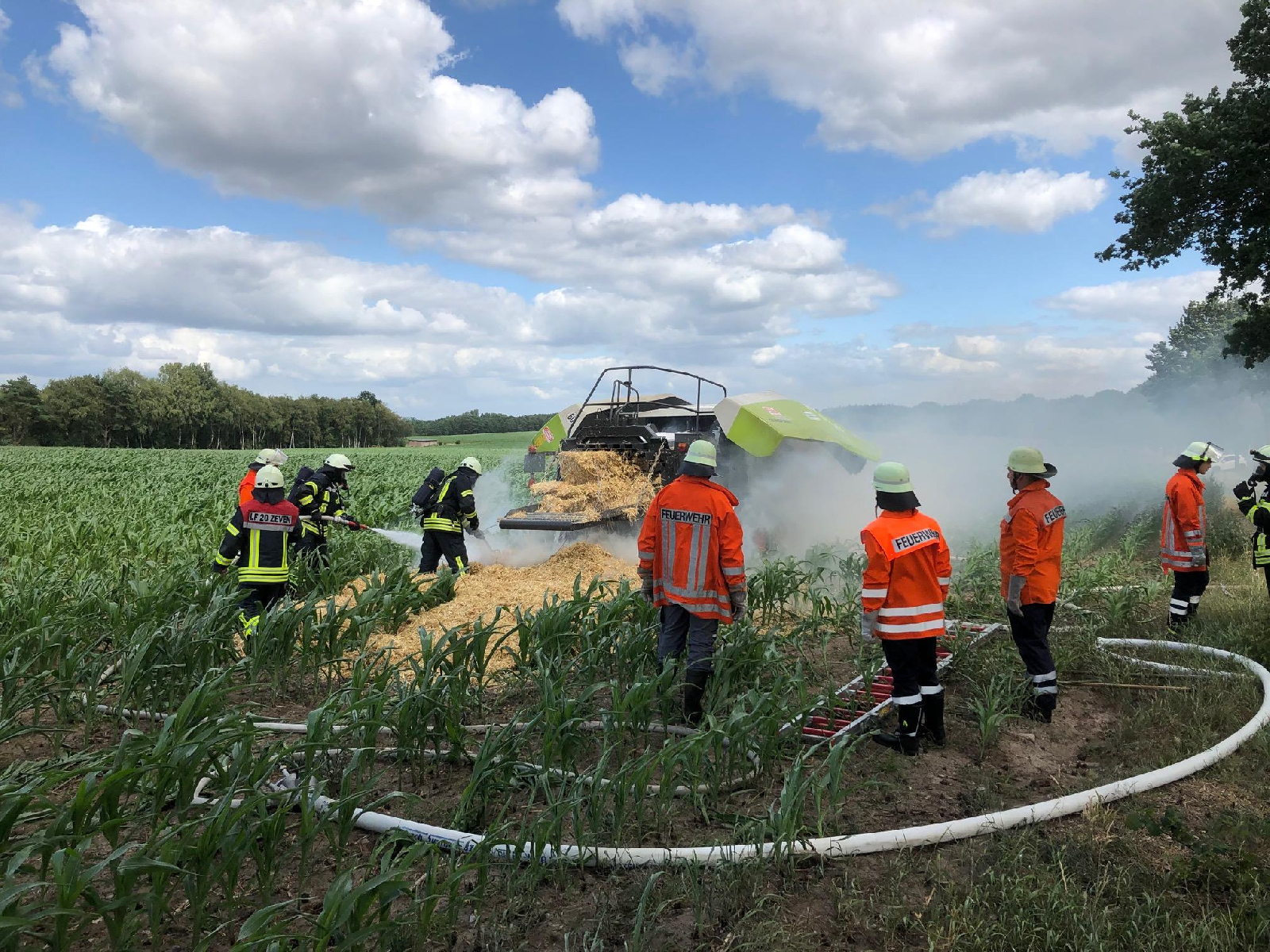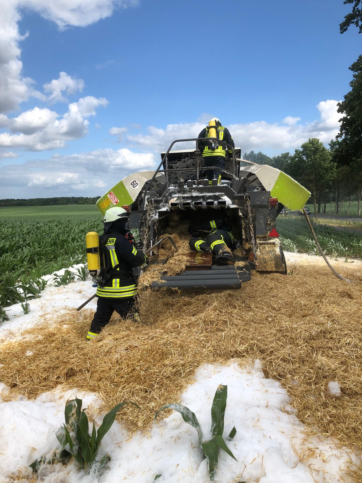 Bademühlen(tw) Alarm für die Ortsfeuerwehren aus Badenstedt und Zeven am 03.07.19 um 15:30 Uhr zu einer brennenden Strohpresse zwischen Bademühlen und Ostereistedt, während des Strohpresssens geriet eine Großballenpresse aus ungeklärter Ursache in Brand. Der Schlepperfahrer hat geistesgegenwärtig die brennende Presse vom Stoppelfeld gefahren und von seinem Schlepper abgehängt,dadurch konnte ein größerer Flächenbrand verhindert werden. Mit den wasserführenden Fahrzeugen aus Badenstedt und Zeven wurde eine Brandbekämpfung durchgeführt. Die Löscharbeiten gestalteten sich schwierig da das teils brennende bzw. glimmende Stroh mühevoll aus der Presse entfernt werden musste.