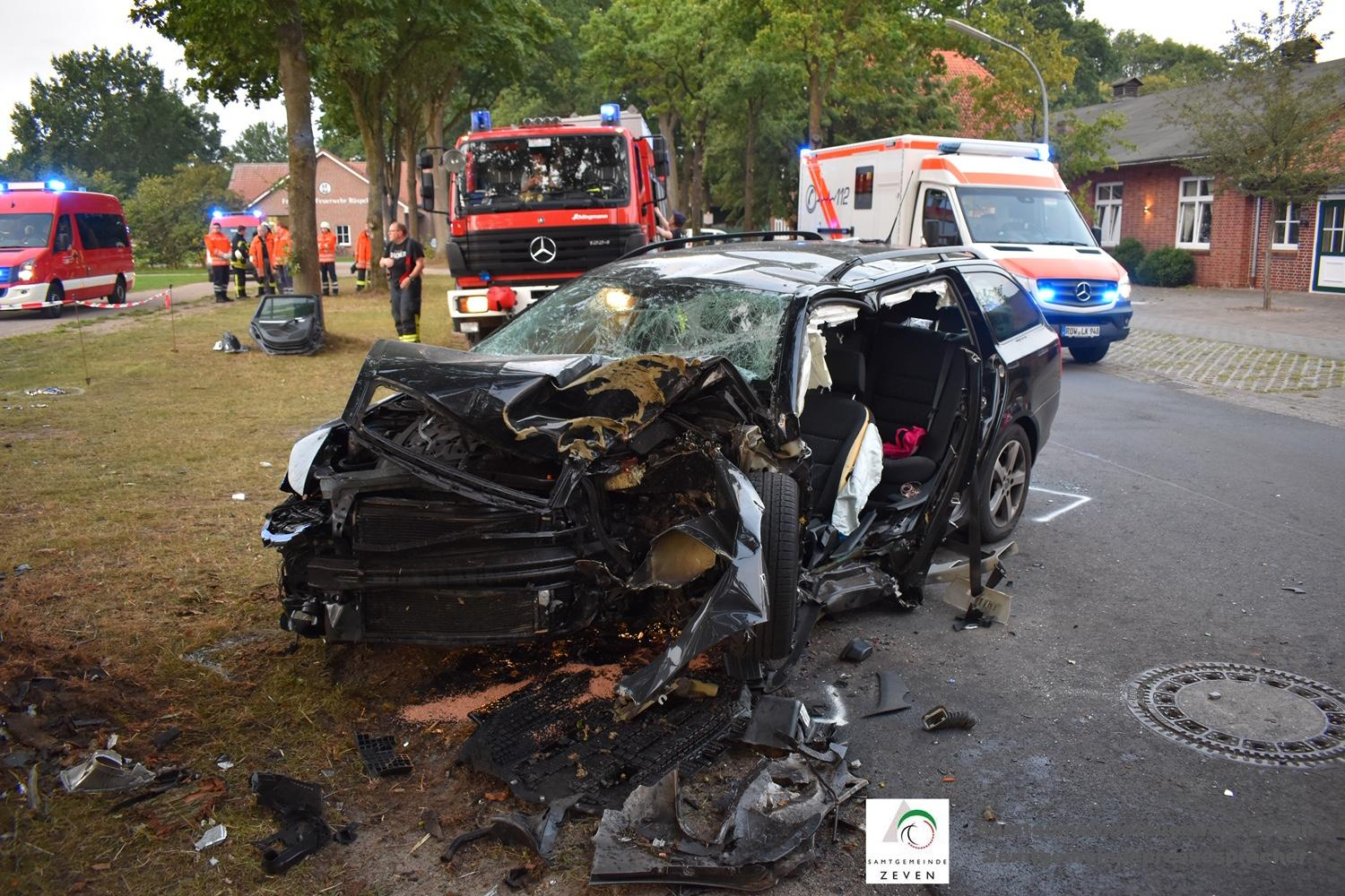 Die alarmierten Feuerwehren aus Rüspel, Elsdorf trafen kurz nach der Alarmierung vor Ort ein und bereiteten die technische Rettung vor. Nach Untersuchung durch den Notarzt, wurde Aufgrund der schwere der Verletzung, entschieden, eine Crash-Rettung durchzuführen. Die Kräfte der Ortsfeuerwehr Elsdorf begannen auf der Fahrerseite mit dem Entfernen der Tür und anschließend mit dem entfernen der B-Säule. Der inzwischen eingetroffene Rüstwagen aus Zeven übernahm parallel die Vorbereitungen zum entfernen des Fahrzeugdaches. Trotz der massiven Verformungen des Fahrzeuges an der Fahrerseite, gelang es den Einsatzkräften die verletzte Person zeitnah aus ihrer Lage zu befreien und an den Rettungsdienst zu übergeben. Auf weitere Massnahmen seitens der Feuerwehr brauchte man nicht zurückgreifen und man konnte mit dem Rückbau der Gerätschaften beginnen. Ausgelaufene Betriebsstoffe wurden mit Bindemittel aufgenommen.