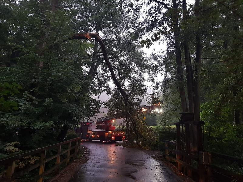 Baum ragt über Fahrbahn – Drehleiter im Einsatz