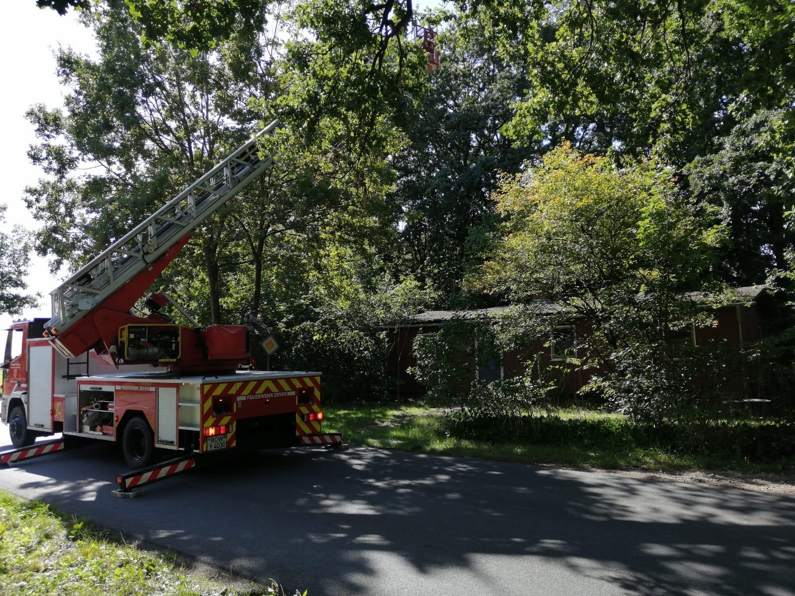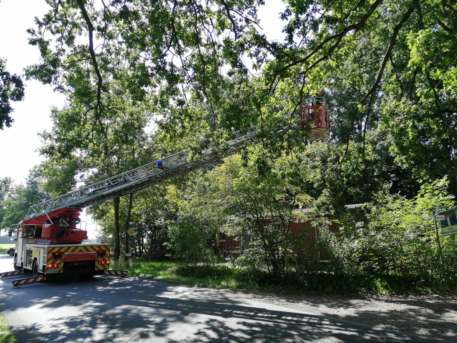 Die Drehleiter der Ortsfeuerwehr Zeven wurde am 05.09.20 durch die Ortsfeuerwehr Buchholz nachgefordert, im Dipshorner Fuhrenweg drohte ein Ast auf die Straße zu fallen. Mittels einer elektrischen Kettensäge konnte die Gefahr schnell beseitigt werden.