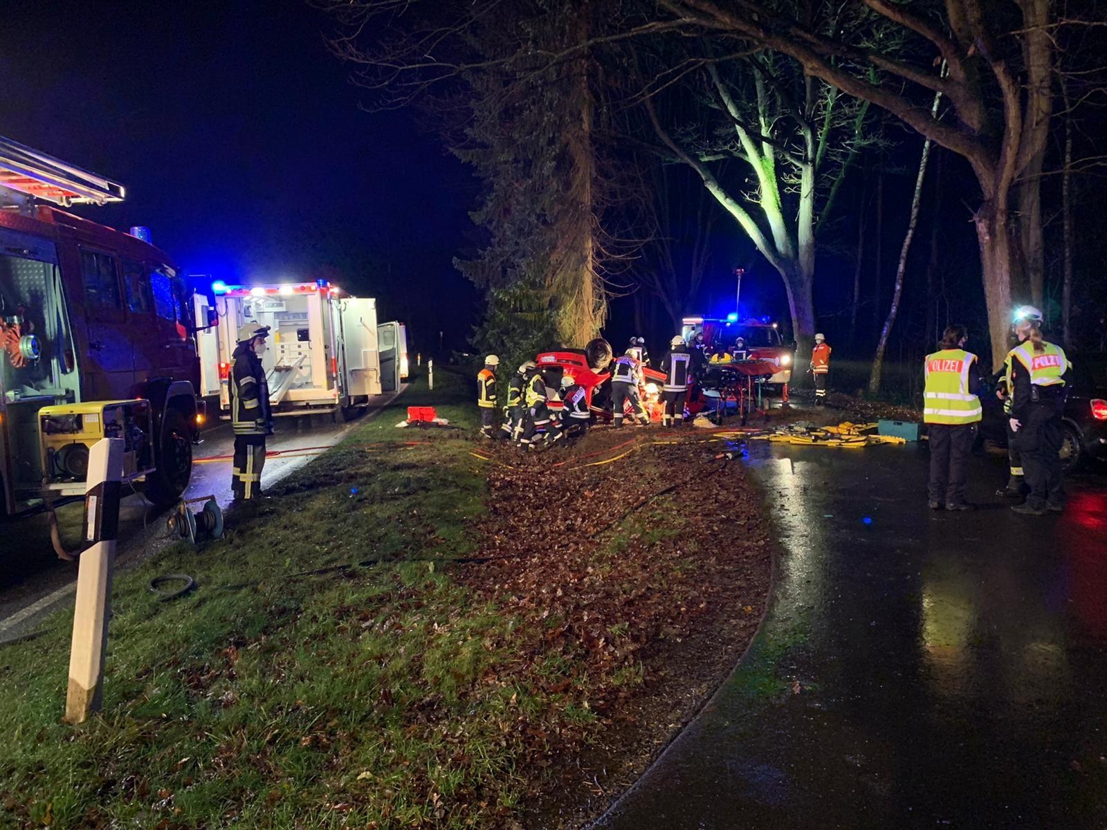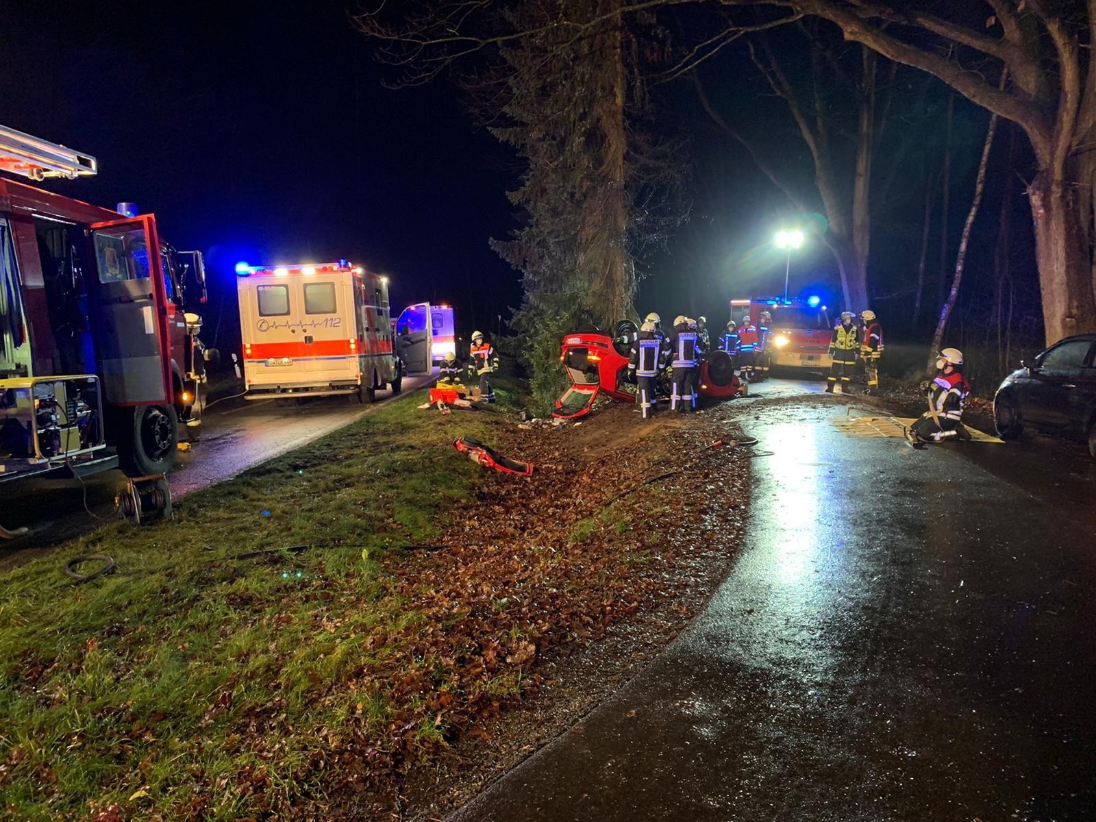 … lautete am 15.12. um 18:18 Uhr das Alarmstichwort für die Feuerwehren Badenstedt und Zeven. Auf der L133 im Bereich „Großen Holz“ ist aus ungeklärter Ursache ein PKW Golf in einer leichten Linkskurve nach Rechts von der Fahrbahn abgekommen und hat sich in einem kleinen Graben überschlagen. Kurz vor einem Baum kam der PKW auf dem Dach liegend zum Stillstand. Der Fahrer wurde dabei in seinem Fahrzeug eingeschlossen, aber nicht eingeklemmt. Gemeinsam mit dem eingetroffenen Rettungsdienst hat man sich dann dazu entschlossen, den Patienten schonend aus dem Fahrzeug zu retten. Dazu wurden die hintere Tür und die B-Säule der Fahrerseite entfernt und der Fahrer, der immer noch im Gurt hing, gegen herunterfallen gesichert. Parallel dazu wurde das Fahrzeug mit Rüstmaterial so gesichert, das es nicht nach hinten in den Graben kippen konnte. Die Ortsfeuerwehr Badenstedt stellte während der Rettungsarbeiten sicher Brandschutz sicher. Nach gut 30 Minuten konnte der Patient aus dem Fahrzeug befreit und an den Rettungsdienst übergeben werden. Im Anschluss an die Rettungsarbeiten wurde die Einsatzstelle für die Unfallaufnahme der Polizei noch ausgeleuchtet.
