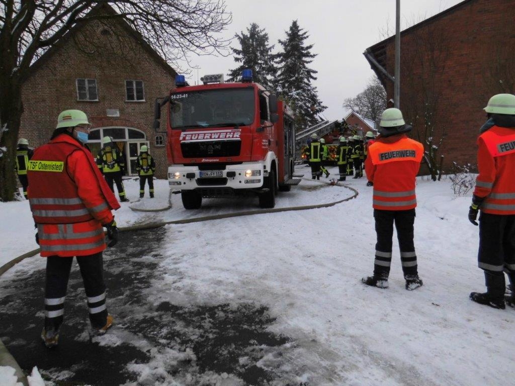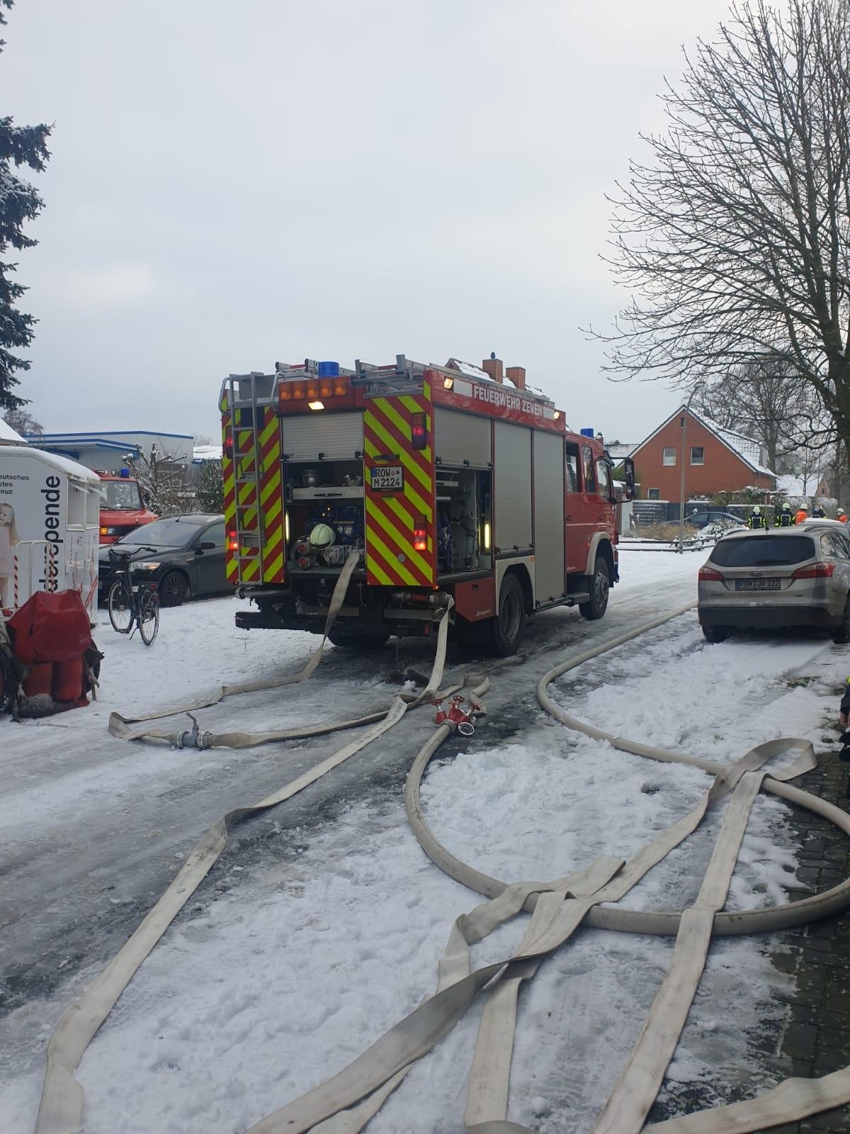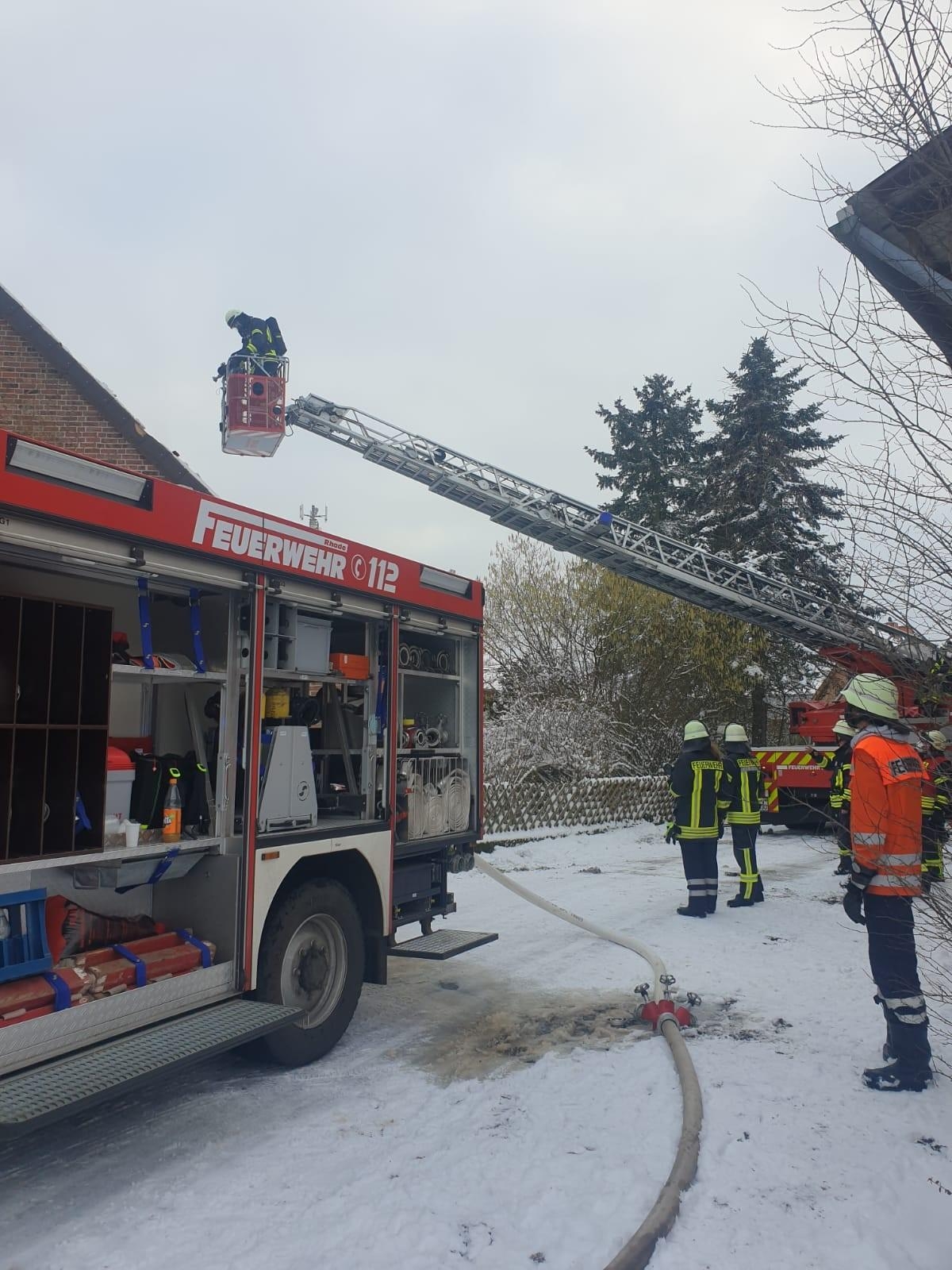 Die Feuerwehren aus Rhade,Rhadereistedt und Rockstedt sowie der Rettungsdienst aus Gnarrenburg wurden am 30.01.21 um 14:43 Uhr zu einer unklaren Rauchentwicklung aus einem Gebäude in Rhade in der Straße Feuerhörn alarmiert. Kurz nach Eintreffen an der Einsatzstelle ließ der Einsatzleiter die Drehleiter aus Zeven nachalarmieren, da Rauch aus dem Dachstuhl auf stieg. Auf Anfahrt der Einsatzkräfte aus Zeven wurde das Stichwort auf F3 erhöht und somit die Kräfte aus Selsingen und Ostereistedt in Marsch gesetzt. Umgehend durchsuchten Atemschutztrupps das Gebäude, da es zunächst unklar war wieviele Pesonen sich noch im Gebäude befinden wurde der Notarzt sowie beide Rettungswagen aus Zeven alarmiert.Es konnte leider nur noch eine Person aus dem Gebäude geborgen werden, weitere Personen befanden sich glücklicherweise nicht im Gebäude.Über die Drehleiter Zeven wurden Teile des Daches geöffnet. Aufgrund der unklaren Lage wurde auch der OrgL Rettungsdienst durch die Einsatzleitstelle für Rettungsdienst und Feuerwehr alarmiert. Ebenfalls vor Ort machten sich Führungskräfte der Kreisfeuerwehr und der Gemeindefeuerwehr ein Bild von der Lage vor Ort.sonstige Informationen
