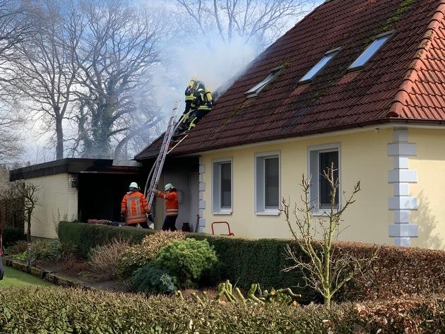 Am heutigen Samstag gegen 13:20 Uhr wurden die Feuerwehren Heeslingen und Weertzen zu einem Garagenbrand in die Straße "Am Holzbeck" gerufen. Dort hatte ein Carport-/ Schuppenkomplex aus bisher unbekannten Gründen angefangen zu brennen. Laut weiteren Anrufen sollten die Flammen schon auf das Wohnhaus übergreifen. Daraufhin wurde die Alarmstufe erhöht und die Feuerwehr Zeven nachalarmiert.Am Einsatzort eingetroffen, fanden die Einsatzkräfte ein Carport mit integrierten Abstellraum in Vollbrand vor. Trotz Löschversuche durch die Eigentümer konnten sich die Flammen rasant ausbreiten und hatten auf der Rückseite des Wohnhauses schon ein großes Fenster zum Bersten gebracht und auf das Dach übergegriffen. Umgehend wurde die Brandbekämpfung im Carport eingeleitet und ein Trupp unter Atemschutz zur Erkundung in das Haus vorgeschickt. Parallel dazu wurde das Dach im Brandbereich geöffnet und dort die Brandbekämpfung eingeleitet. Dank des schnellen Eingreifens der Feuerwehr konnte so ein größerer Schaden am Dach und im Wohnhaus verhindert werden.