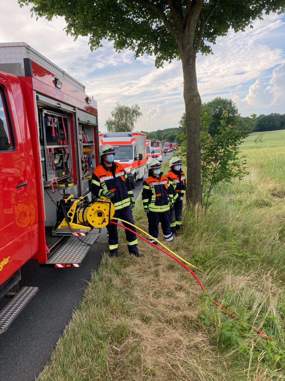 Für die Dauer der Rettungs- und Bergungsarbeiten musste die Kreisstraße in beiden Richtungen voll gesperrt werden. Die Ermittlungen zur Unfallursache hat die Polizei aufgenommen. Nach über einer Stunde war der Einsatz für die Feuerwehren beendet. Glücklicherweise waren zahlreiche Ersthelfer vor Ort, um Erste-Hilfe zu leisten.