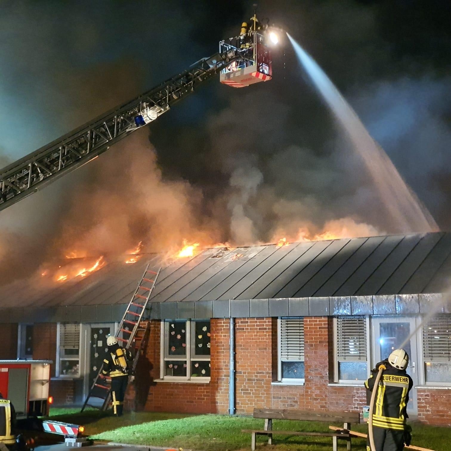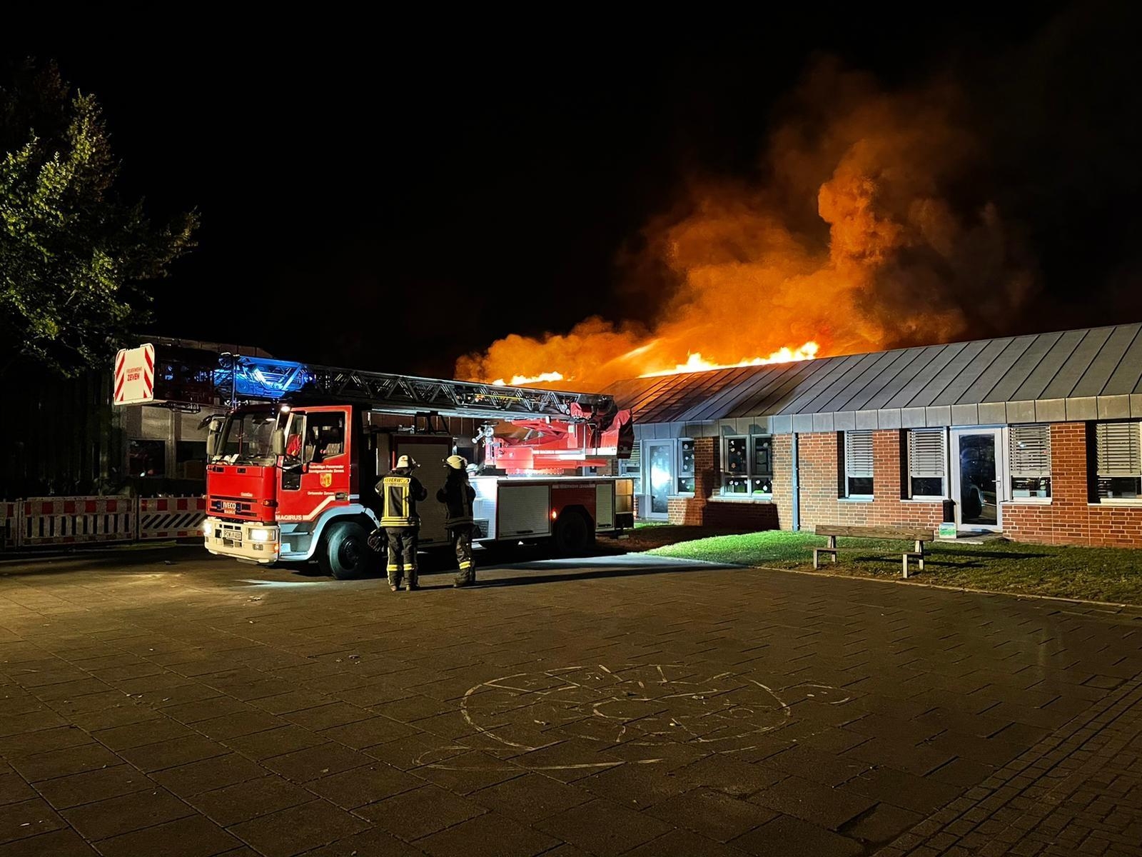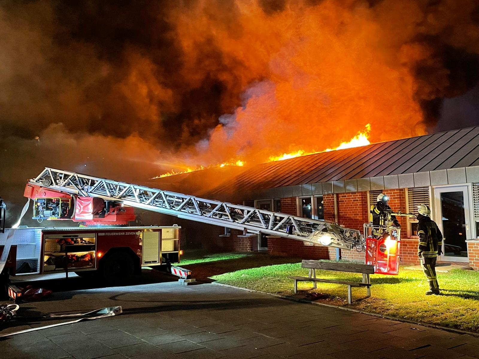 Um kurz nach drei Uhr wurde der Feuerwehr per Notruf auf dem Gelände des Mehrgenerationenhaus in Zeven, beim dortigen Kindergarten, ein Feuer gemeldet. Umgehend wurden die Feuerwehren aus Zeven, Brauel und Heeslingen an die Einsatzstelle alarmiert. Durch den mitalarmierten Rettungsdienst konnte das Feuer kurz darauf bestätigt werden und es wurde sofort die Alarmstufe erhöht und eine zusätzliche Drehleiter (aus Bremervörde) dazu alarmiert. Als die ersten Kräfte aus Zeven an der Einsatzstelle eintrafen, hatte sich auf der Rückseite des Gebäudes die Flammen bereits in den Dachstuhl "gefressen" und begannen sich dort weiter auszubreiten. Sofort wurde ein Löschangriff mit mehreren Strahlrohren vorgenommen. Parallel dazu wurden die beiden Drehleitern aus Zeven und Bremervörde in Stellung gebracht und auch von dort mit der Brandbekämpfung angefangen. Auch von der Gebäudevorderseite wurden weitere Strahlrohre zur Brandbekämpfung eingesetzt. Wie sich im Verlauf herausstellte, gestalteten sich die Löschmaßnahmen schwierig und zeitaufwendig, da große Teile des Daches mit Blechplatten gedeckt war und erst mit speziellen Sägen Löcher in die Dachhaut geschnitten werden mussten, um an das Feuer zu gelangen. Da diese Arbeiten und die Brandbekämpfung nur unter schweren Atemschutz durchgeführt werden konnten, wurden noch weitere Feuerwehren mit Atemschutzgeräteträger an der Einsatzstelle benötigt. Insgesamt kamen während des Einsatzes 70 Atemschutzgeräteträger zum Einsatz. Im weiteren Verlauf des Einsatzes wurde noch ein Bagger an die Einsatzstelle beordert, um das Dach bzw. das Gebäude zu öffnen, damit man besser an den Brand und später an die Glutnester heran kam. Die Löscharbeiten zogen sich über mehrere Stunden hin. Gebäudeteile die nicht direkt vom Brand betroffen waren, konnten von der Feuerwehr gehalten werden, können aber Aufgrund von Rauchbeaufschlagung und zum Teil durch Löschwasser nicht genutzt werden. Der benachbarte, direkt angrenzende Kindergarten konnte Dank einer massiven Brandschutzwand gehalten werden. Im angrenzenden Wohngebiet wurden durch die Meßgruppe des Gefahrgutzuges Messungen durchgeführt, da es während des Brandes zu einer starken Rauchentwicklung kam. Die Bevölkerung wurde über Radio entsprechend gewarnt.Vor Ort machten sich von Seiten des Betreibers, der Stadt Zeven und Führungskräfte der Kreis- und Gemeindefeuerwehr während des Einsatzes ein Bild der Lage. Der Energieversorger und der Bauhof Zeven waren ebenfalls vor Ort. Erste, nicht mehr benötigte Einsatzkräfte konnten gegen 9:00 Uhr die Einsatzstelle wieder verlassen. Die Lösch- und Nachlöscharbeiten zogen sich dann noch bis ca. 11:00 Uhr hin. Während des gesamten Einsatzes unterstütze des DRK aus Zeven und Bremervörde die Löscharbeiten mit bereitgestellten Rettungsmitteln und dem Versorgungszug. Die Drohnengruppe des DRK sorgte für entsprechende Luftaufnahmen.