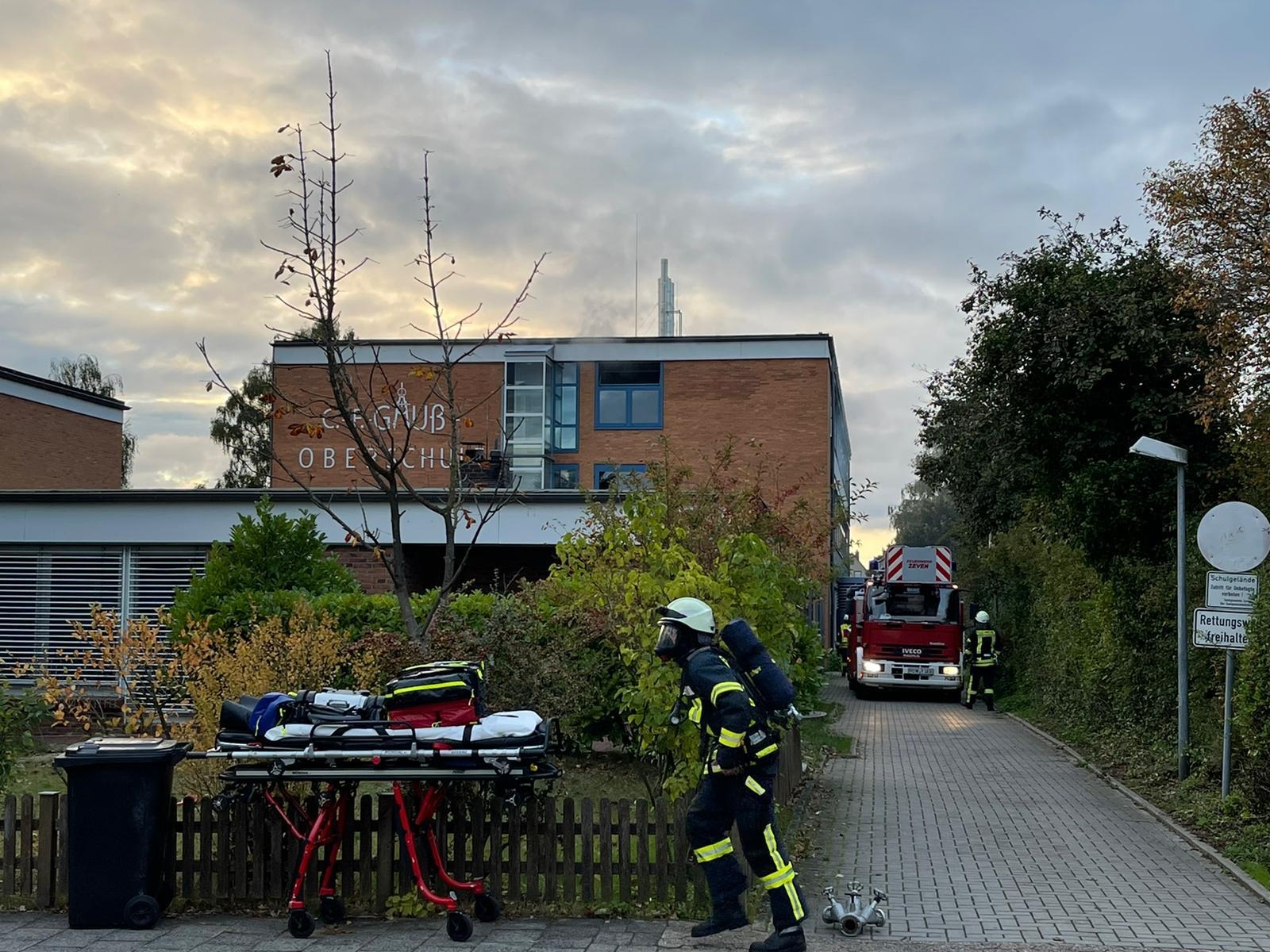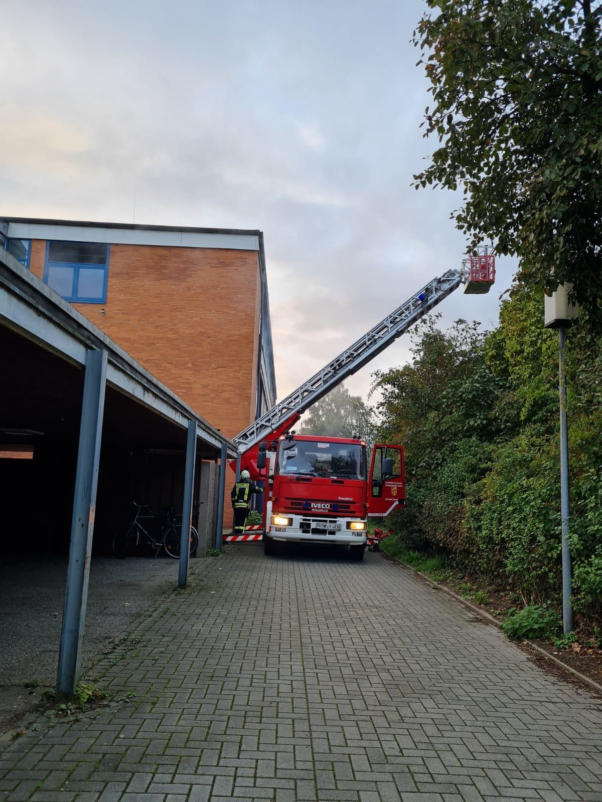 Am Mittwochnachmittag gegen 17:53 wurde per Notruf eine starke Rauchentwicklung aus der ehemaligen Carl-Friedrich-Gauß-Schule in Zeven am Lühnenfeld gemeldet. Umgehend wurden die Feuerwehren Zeven, Brauel, Brüttendorf und Heeslingen per Vollalarm dorthin alarmiert. Vor Ort konnte ein starke Rauchentwicklung im ersten und zweiten Obergeschoss des zweistöckigen Gebäudes festgestellt werden. Da die Gebäude seit längerer Zeit leerstehen und nicht anderweitig genutzt werden, konnte auf eine Personensuche verzichtet und unverzüglich mit der Suche nach dem genauen Brandort begonnen werden. Dazu gingen mehrere Trupps unter schweren Atemschutz in das Gebäude vor und suchten alle Räume im ersten und zweiten Stock ab. In einem ehemaligen Physikraum im ersten Stock konnte dann der Brandherd lokalisiert und das Feuer zügig abgelöscht werden. Anschließend wurde der Bereich mit der Wärmebildkamera kontrolliert. mit einem Hochleistungslüfter wurde das Gebäude anschließend rauchfrei gemacht. Die Drehleiter aus Zeven leuchtete von außen den Bereich entsprechend aus. Von der Hofseite wurde noch ein zweiter Löschangriff vorbereitet, der aber in Bereitstellung blieb. Die Wasserversorgung wurde aus naheliegender Hydranten aufgebaut. Nach etwas über einer Stunde konnte dann "Feuer aus" gemeldet werden. Die anschließenden Aufräumarbeiten zogen sich dann noch bis ca 20:10 Uhr hin. Die vorsorglich aus Bremervörde alarmierte zweite Drehleiter brauchte kam nicht mehr zum Einsatz und konnte schnell die Einsatzstelle wieder verlassen.