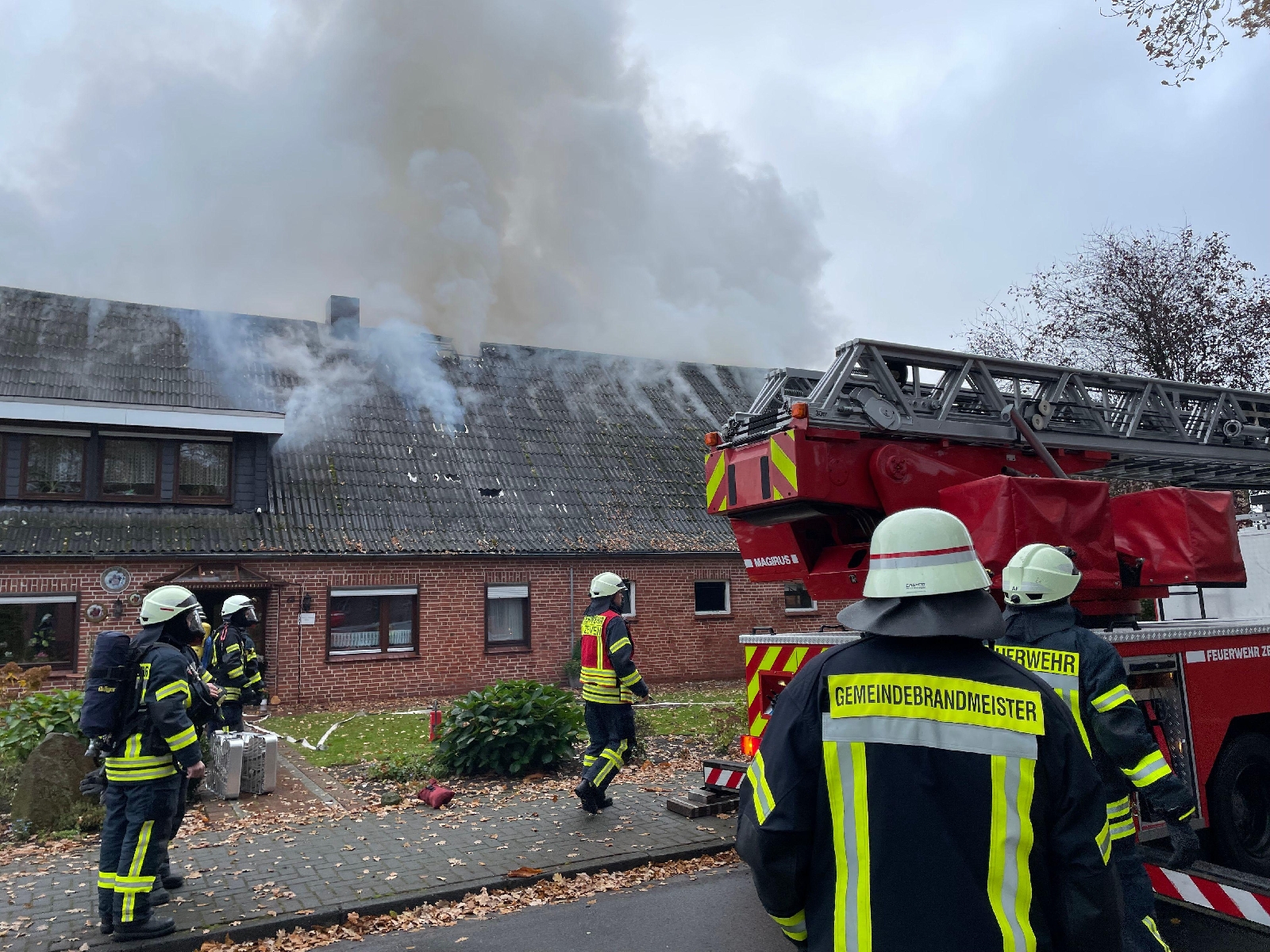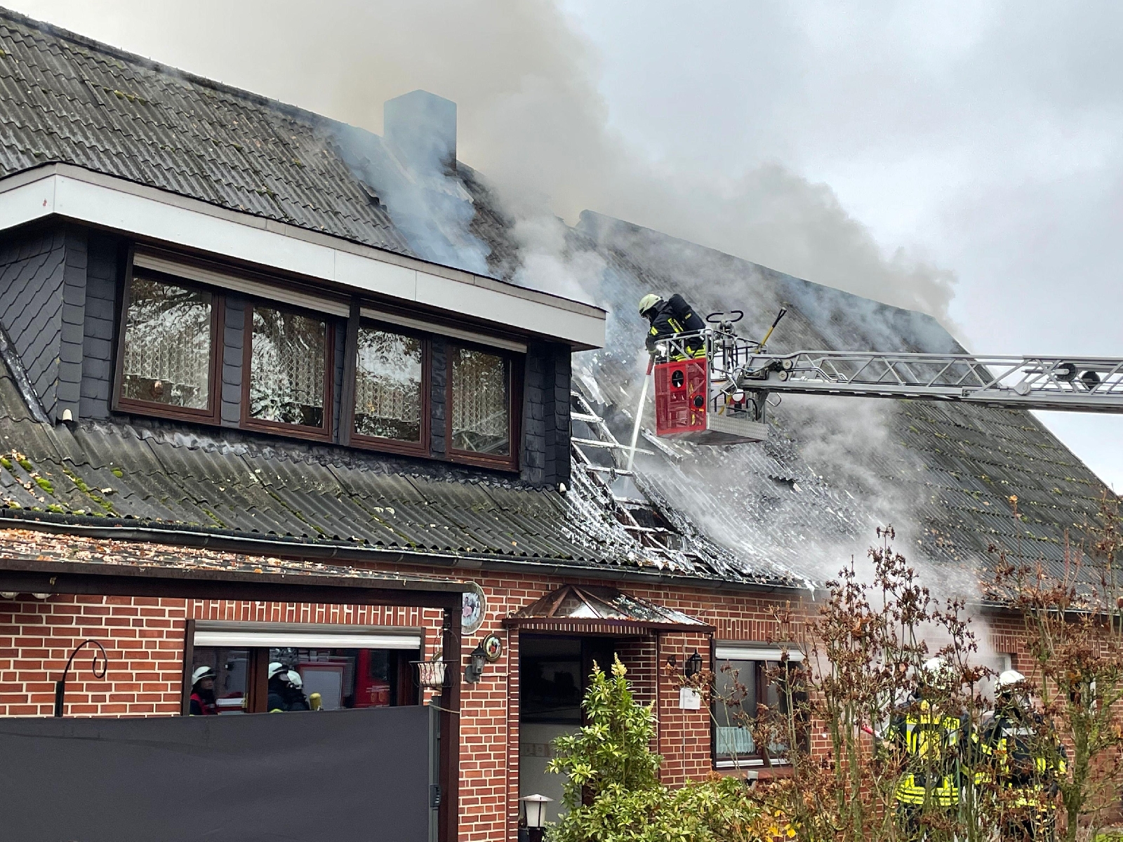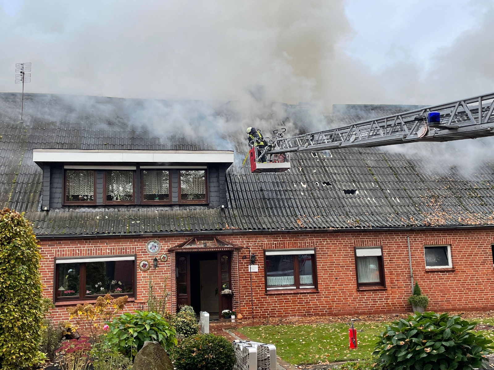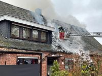 Bei Eintreffen der Einsatzkräfte drang dichter Rauch aus dem Dachstuhl. Das Feuer hatte sich auch schon durch die Dachplatten durchgefressen. Umgehend ging ein Trupp unter Atemschutz zur Erkundung ins Gebäude vor. Der linke Teil, wo sich der Wohnbereich befand, war nur verraucht. Das Feuer beschränke sich auf den rechten Teil des Gebäudes, dem ehemaligen landwirtschaftlich genutzten Teil. Auf dem Boden lagerte Stroh. Mit zwei Drehleitern mussten die Dachplatten mittels Einreißhacken entfernt werden, um an die Flammen heranzukommen. Diese Arbeiten gestalteten sich sehr schwierig, da die Platten von der Hitze schon platzten. Glücklicherweise konnte ein Übergreifen auf Nachbargebäude durch eine Riegelstellung verhindert werden.