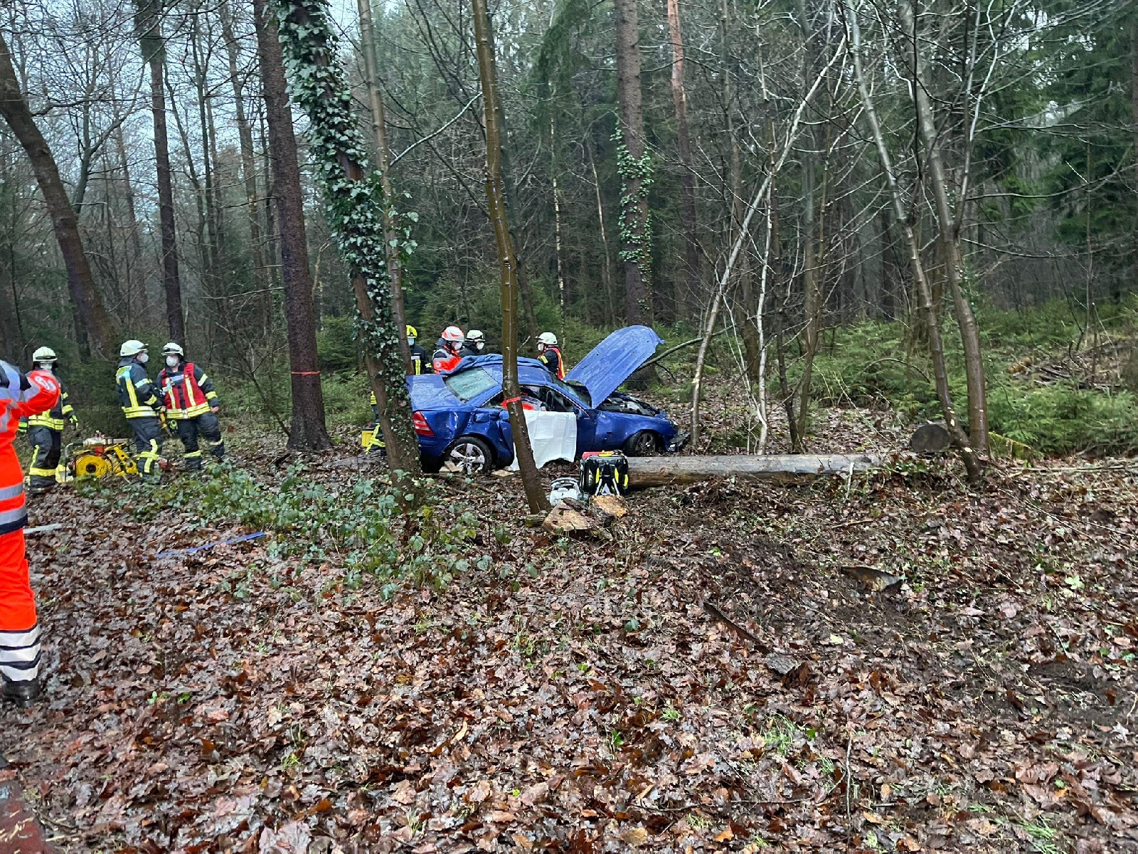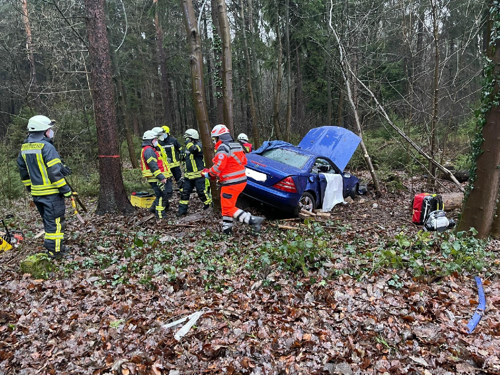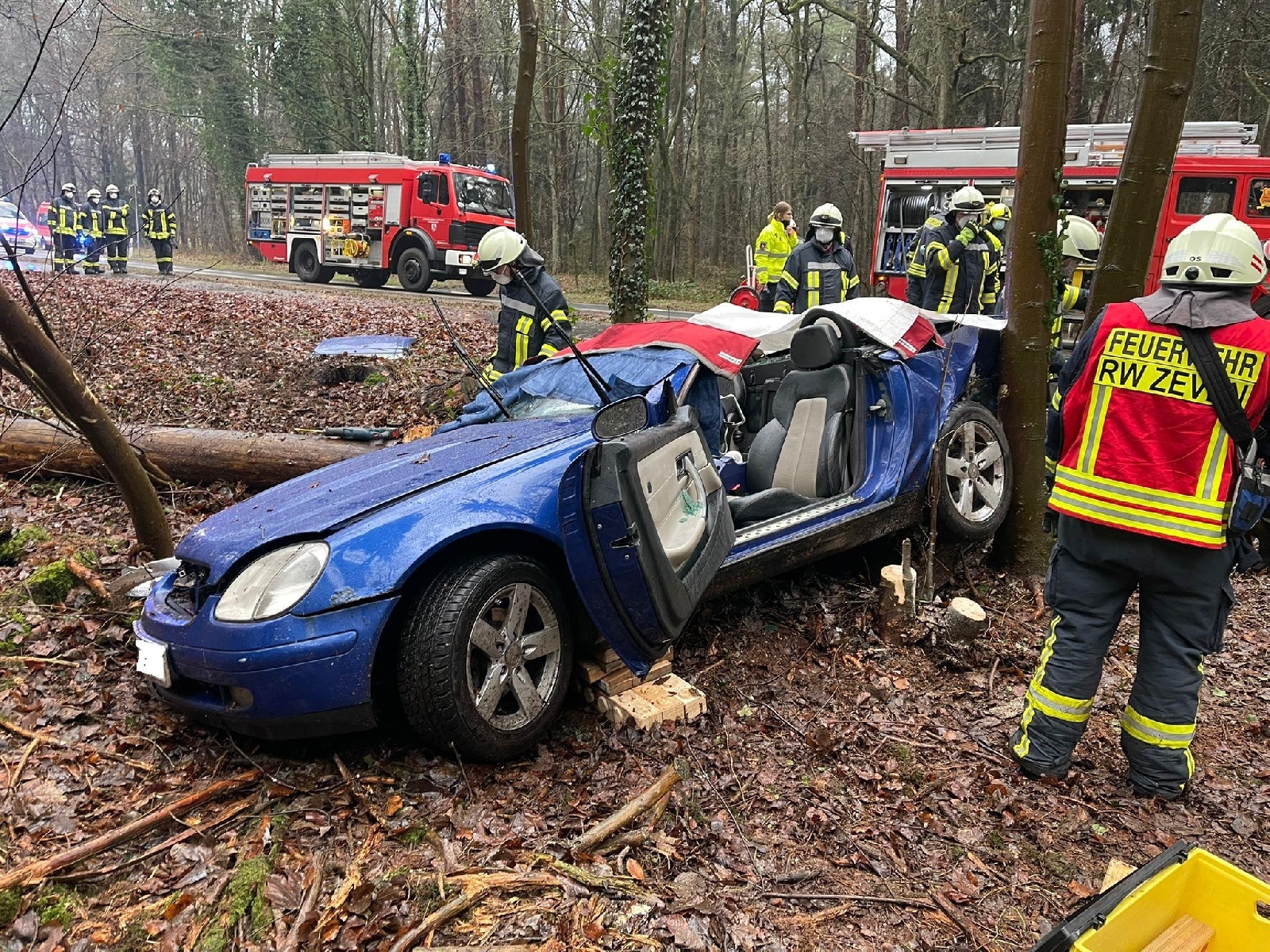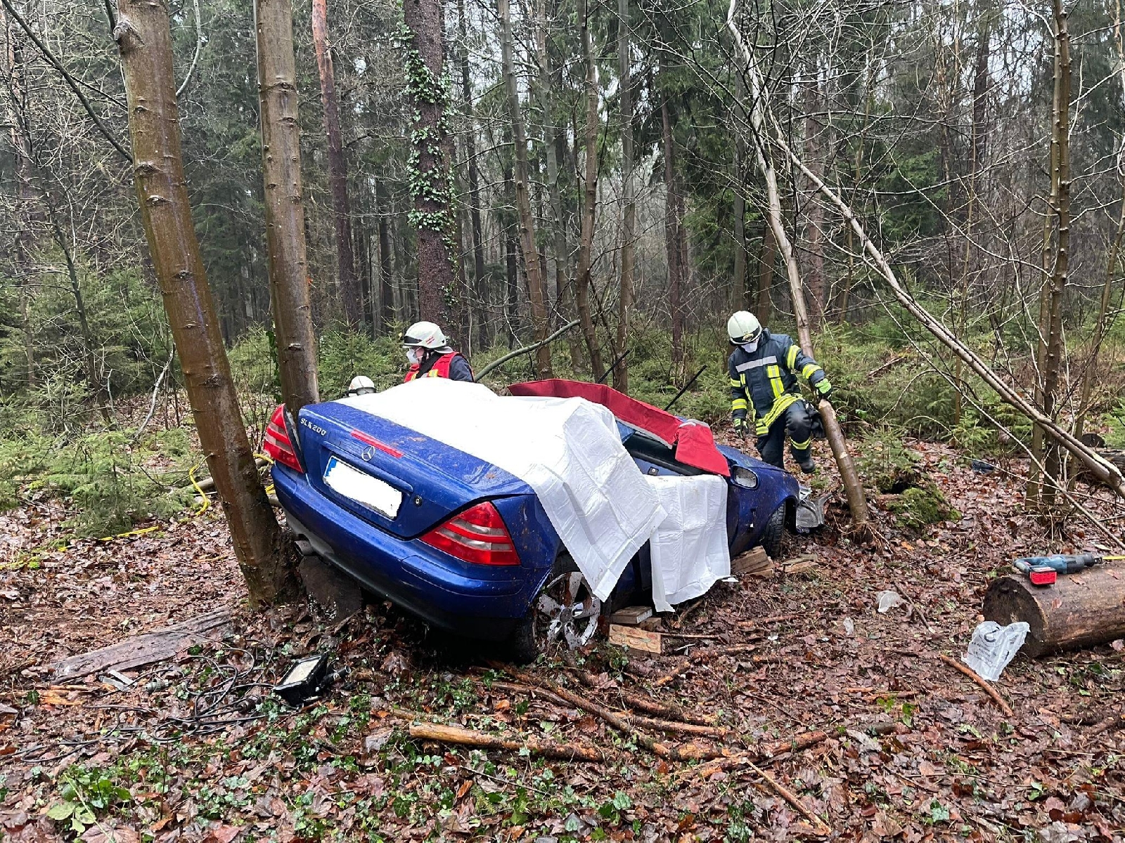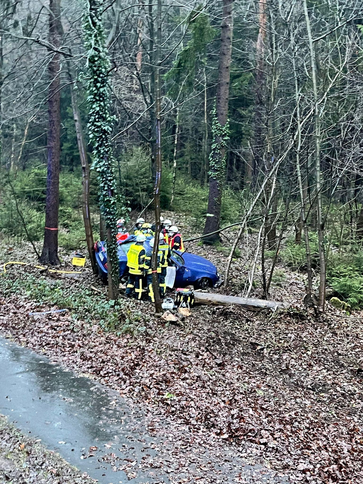 Aus bisher ungeklärter Ursache ist der Fahrer eines Mercedes SLK von der Straße aabgekommen und in ein angrenzendes Waldstück zum stehen gekommen. Der Fahrer wurde dabei in seinem Fahrzeug eingeklemmt.