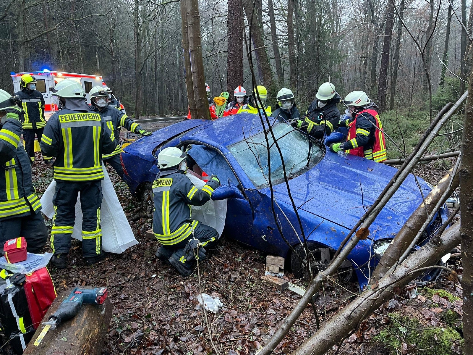 Zunächst musste das Fahrzeug stabilisiert und ein Baum mittels Kettensäge entfernt werden. Mit hydraulischem Rettungsgerät wurde das Dach entfernt um den Patienten anschließend schonend aus dem Unfallwrack zu retten.