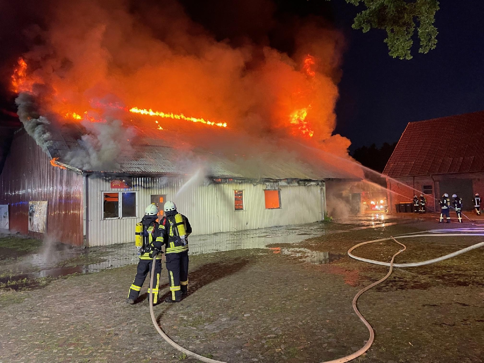 Großfeuer vernichtet Scheune – Feuerwehren im GroßeinsatzWistedt OT Hofkoh (as). Gegen 22.30 Uhr am späten Donnerstagabend kam es im Wistedter Ortsteil Hofkoh zu einem Großfeuer. Aus ungeklärter Ursache kam es in einer Scheune, die für gewerbliche Zwecke genutzt wurde, zu einem Brand. Die zwischen Zeven und Wistedt gelegene Scheune stand bei Eintreffen der Feuerwehren bereits in Vollbrand.