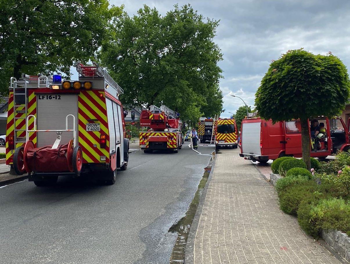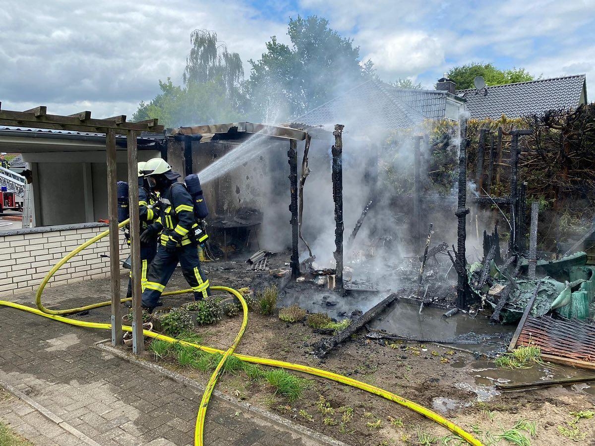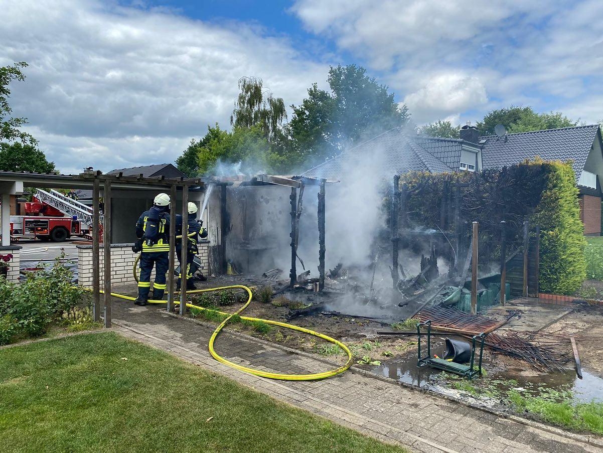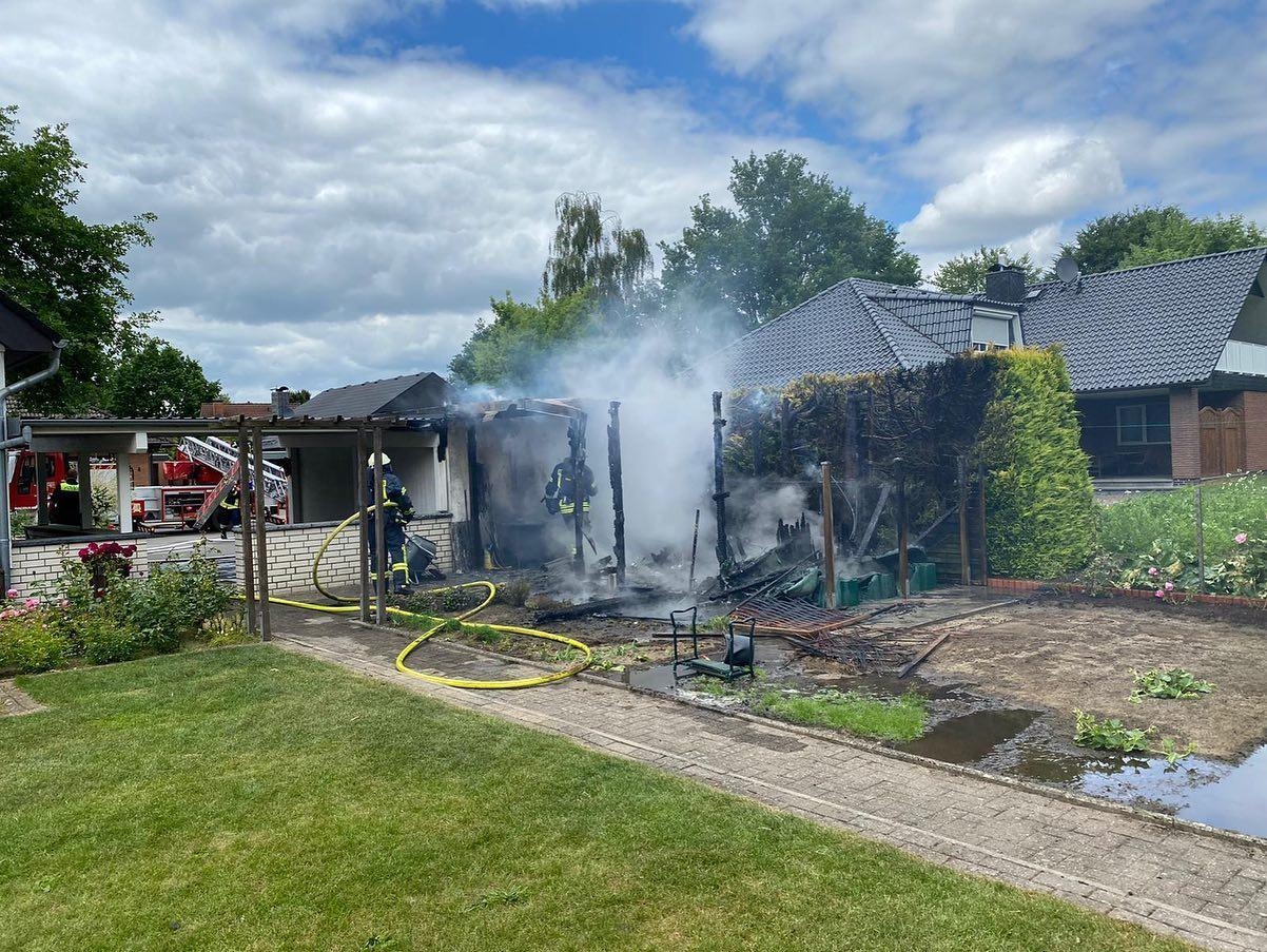 Brandeinsatz - Eigentlich sollte es ein gemütlicher Nachmittag werden, denn eine Abordnung der Zevener Feuerwehr befand sich an der Baustelle des neuen Feuerwehrhauses, um der Grundsteinlegung beizuwohnen. Doch der Melder schrillte und rief zur freiwilligen Pflicht.Ein Gartenschuppen stand in Vollbrand, eine angrenzende Garage mit einem Fahrzeug darin, befand sich in Gefahr. Zwei Trupps gingen unter Atemschutz zur Brandbekämpfung vor. Ein weiterer Trupp befand sich in sogenannter Bereitstellung. Die Feuerwehr Brauel stellte die Wasserversorgung vom Hydranten zum Löschgruppenfahrzeug her.