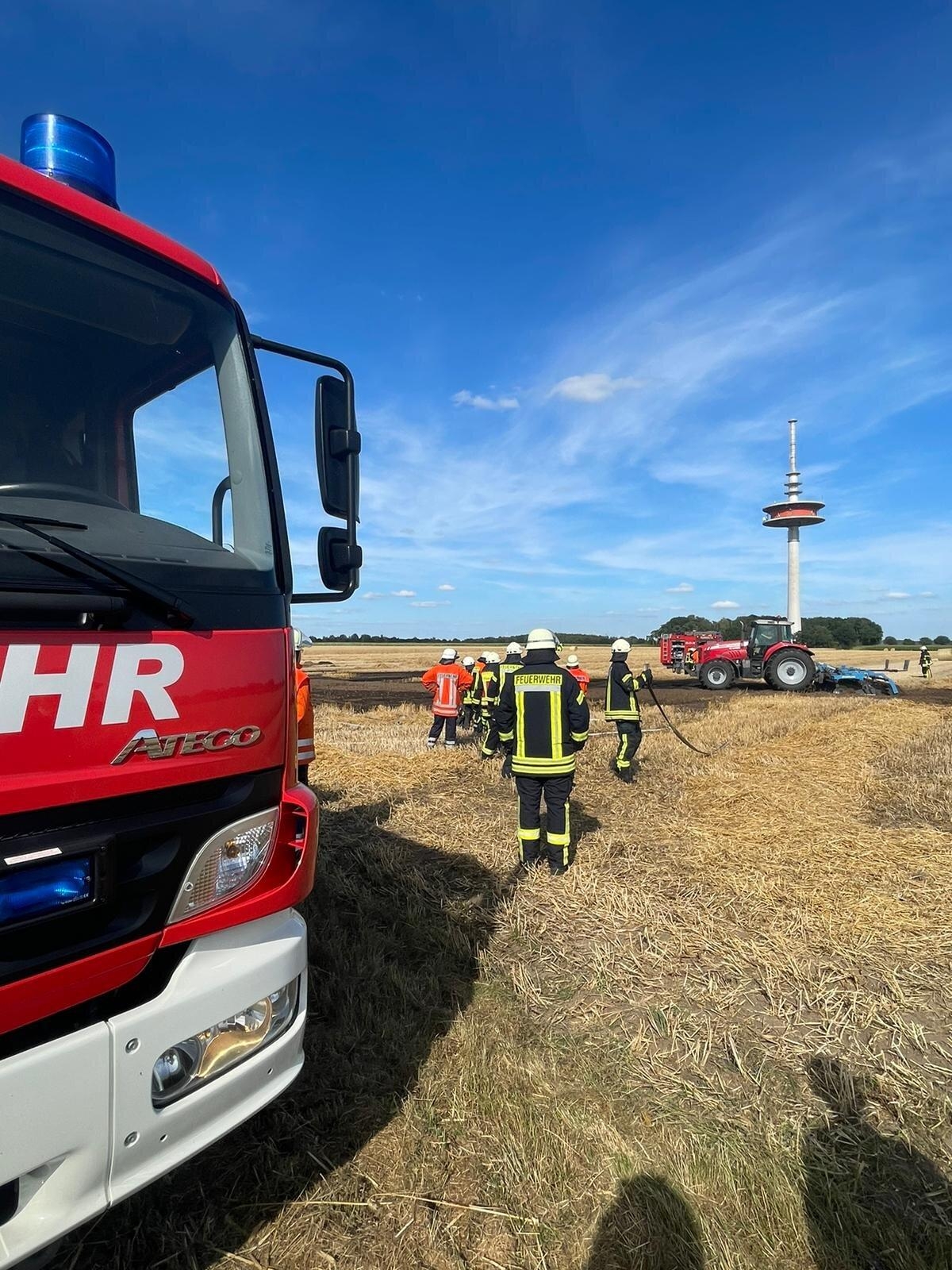 Feuerwehren verhindern größeren Flächenbrand(jz)Am späten Nachmittag des 28. Juli 2022 wurden die Feuerwehren aus Steddorf, Wense, Boitzen, Heeslingen, Klein Meckelsen und Zeven zu einem Flächenbrand alarmiert. Durch einen technischen Defekt an einer Ballenpresse kam es zu einem Feuer auf einem abgeernteten Feld. Auf Anfahrt konnte schon eine starke Rauchentwicklung wahrgenommen werden. Vor Ort drohte das Feuer auf die umliegenden Felder überzugreifen. Durch den Einsatz eines Wasserwerfers, mehrerer C-Rohre und Brandpatschen konnte das Feuer schnell unter Kontrolle gebracht werden. Die Nachlöscharbeiten wurden durch einen Landwirt mittels Grubber unterstützt.