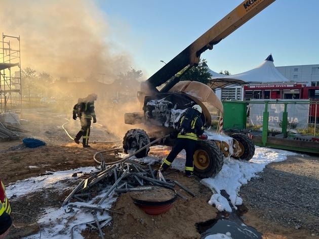 Am heutigen Abend des 12.08.2022, bemerkte eine Gruppe von Motorradfahrern auf dem Gelände des neuen Feuerwehrhauses in Zeven eine Rauchentwicklung an einer selbstfahrenden Hubarbeitssbühne und alarmierte die Feuerwehr. Die eintreffenden Kräfte aus Zeven versuchten das Feuer unter Atemschutz mit einem Schnellschaumrohr zu löschen, was sich durch das auslaufende Hydrauliköl und den Diesel etwas schwieriger gestaltete als zunächst angenommen. Da die Arbeitsbühne viele verbaute Ecken hatte, aus denen immer wieder brennende Öle ausliefen, wurden einzelne Teile abgebaut und immer wieder nachgelöscht.Die am Ende, nicht mehr brennenden, aber dennoch auslaufenden Betriebsstoffe wurden mit Eimern und Bindemittel aufgefangen und abgebunden. Anschließend konnte die Feuerwehr Zeven ihr zukünftiges Gerätehaus wieder verlassen und an ihren alten, noch aktuellen Standort zurückkehren.