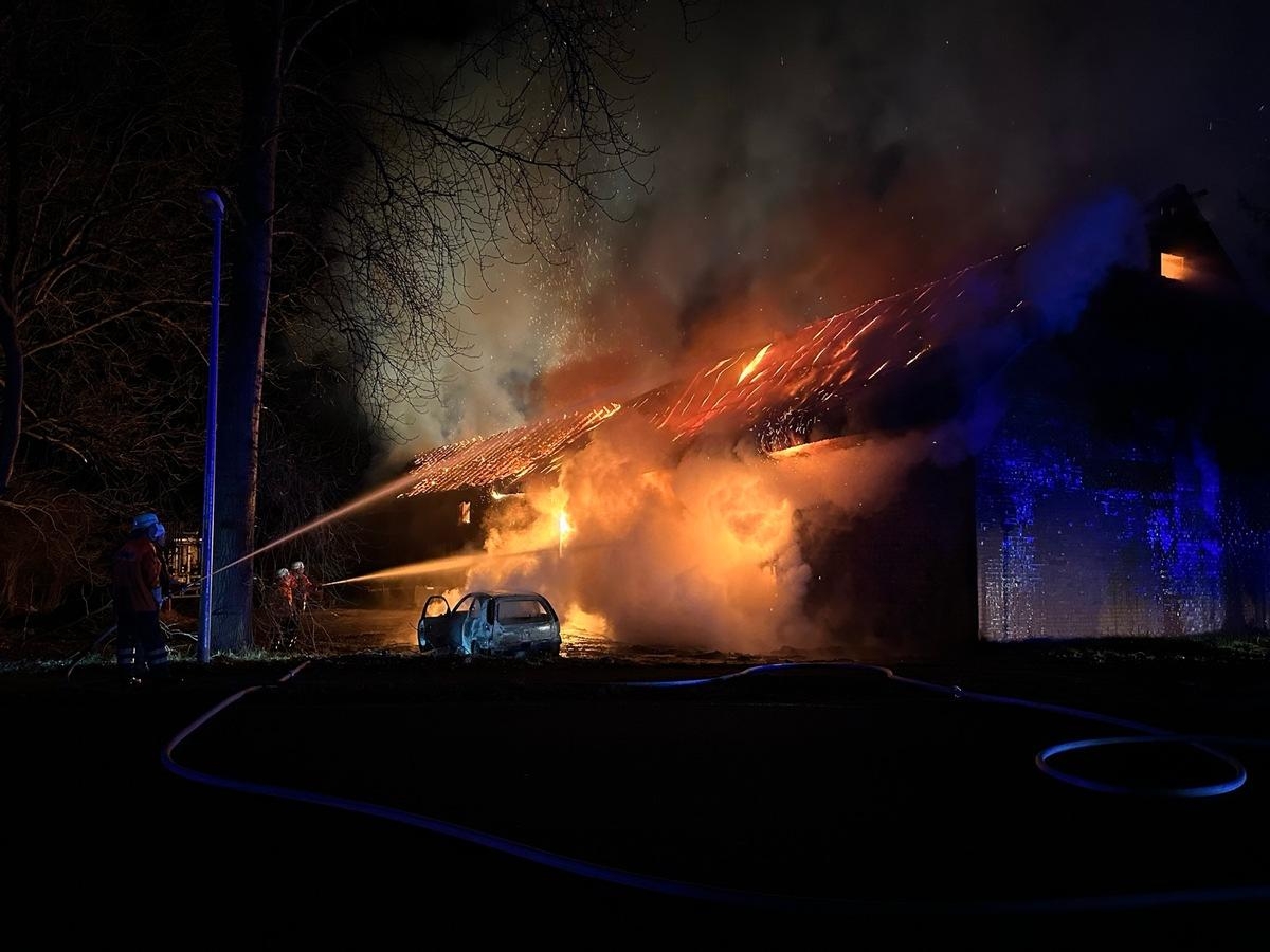 Um kurz nach Mitternacht wurde der Feuerwehr per Notruf ein Verkehrsunfall mit einem PKW in Badenstedt gemeldet. Laut den ersten Meldungen sollte das Fahrzeug brennen und das Feuer schon auf die ca. 15x65m große Scheune übergegriffen haben. Umgehend wurden die Feuerwehren Badenstedt, Ostertimke, Zeven und der Rettungsdienst alarmiert. Diese fanden kurze Zeit später folgende Lage vor. Ein brennender PKW stand neben der Scheune, der Fahrer lag schwer Verletzt auf dem Radweg und wurde von Ersthelfern betreut, die Scheune stand bereits in Vollbrand und das Feuer drohte auf das Wohnhaus überzugreifen. Daher wurde umgehend die Alarmstufe erhöht und weitere Feuerwehren nachalarmiert. Zusätzlich wurde noch die Drehleiter aus Rotenburg angefordert. Das Wohnhaus wurde mit einer "Riegelstellung" und später durch den Einsatz der Zevener Drehleiter in dem Bereich erfolgreich geschützt bzw. gehalten werden. Unter Einsatz mehrerer Strahlrohre, einem mobilen Wasserwerfer und den Wenderohren der Drehleitern konnte das Feuer von drei Seiten bekämpft werden. Diese Maßnahmen zeigten schnell Erfolg, so dass das Feuer bald unter Kontrolle war.