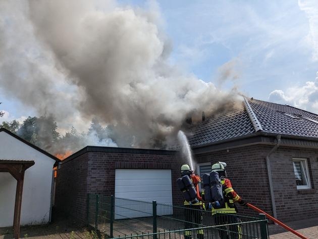 Das ersteintreffende Fahrzeug baute sofort mit einem Trupp unter Atemschutz eine Riegelstellung auf, um angrenzende Gebäude zu schützen. Der zweite Trupp ging unter PA zur Brandbekämpfung vor. Weitere ankommende Fahrzeuge unterstützen die Arbeiten von mehreren Seiten und über zwei Drehleitern. Dabei waren bis zu fünf Trupps unter Atemschutz zeitgleich im Einsatz. Um 16:50 Uhr konnte "Feuer unter Kontrolle" gemeldet werden. Es folgte die weitere Aufnahme der Dachpfannen und das Öffnen der Dächer von Schuppen und Garage, um Glutnester zu finden und abzulöschen, da ein erneutes Aufflammen verhindert werden sollte. Ebenso wurde das Nachbargebäude mittels Hochdrucklüfter belüftet, da in diesem Brandrauch festgestellt wurde. Um 18:15 Uhr konnte schließlich "Feuer aus" gemeldet werden, sodass gegen 19 Uhr das letzte Fahrzeug die Einsatzstelle verlassen konnte. Im Feuerwehrhaus erfolgte dann die Nachbereitung des Einsatzes.