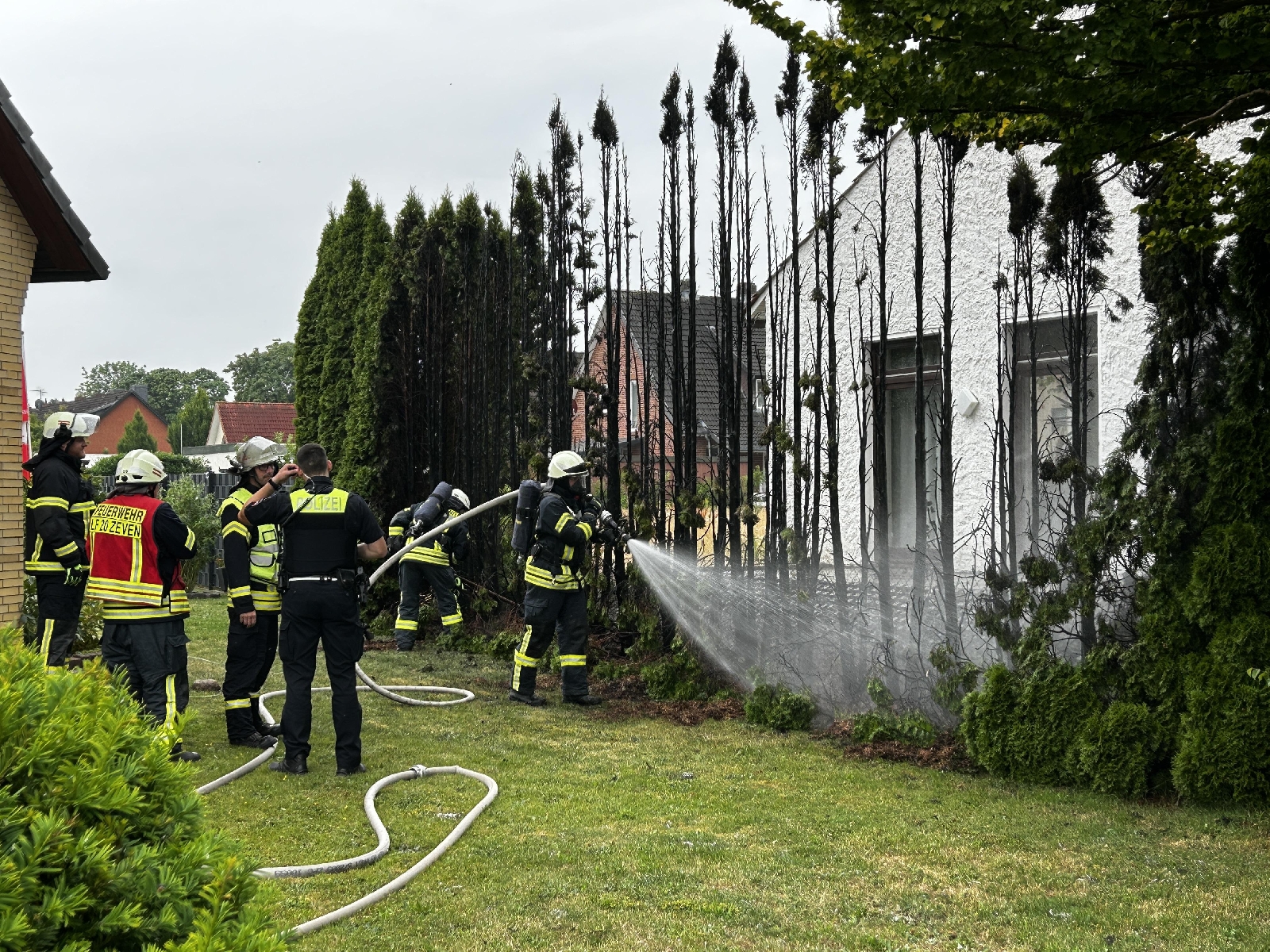 Anwohner hatten bereits begonnen mit Gartenschläuchen und Feuerlöschern das Feuer zu bekämpfen.
