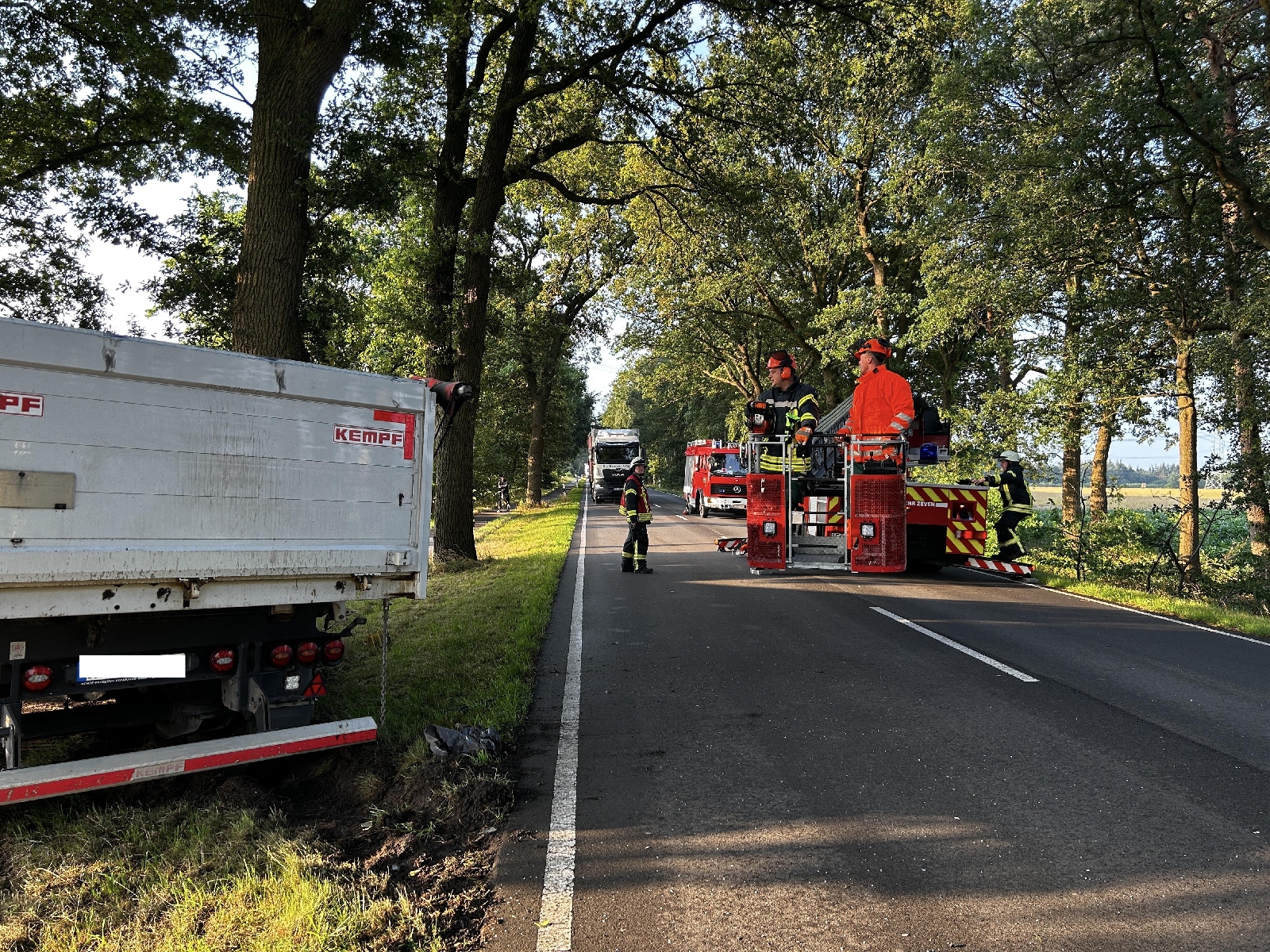 Die Feuerwehr Gyhum, die mit 9 Einsatzkräften vor Ort war, stellte bei genauer Erkundung der Unfallstelle fest, dass der durch den LKW gefällte Baum, noch in den anderen Baumkronen hing und forderte die Drehleiter der Feuerwehr Zeven nach um den Baum von oben abtragen zu können.