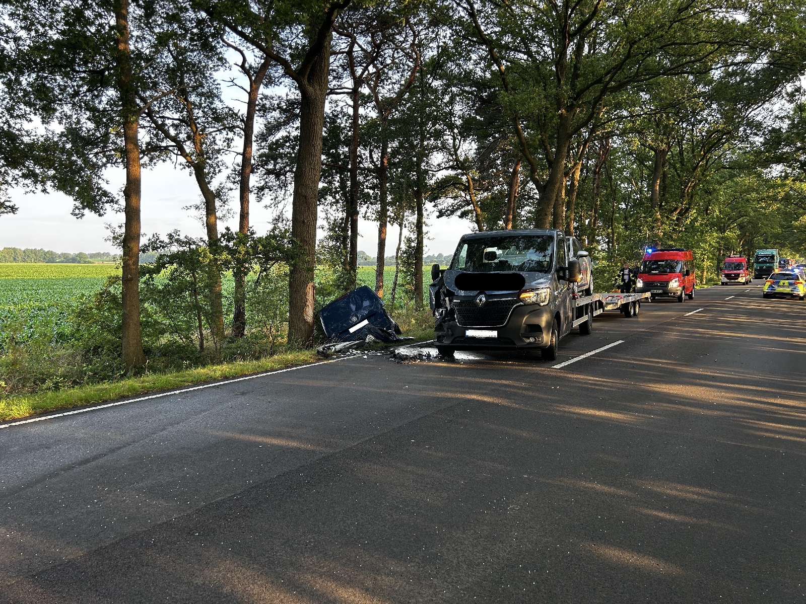 Nach Angaben der Polizei, ist der Fahrer eines VW-Kastenwagens der in Fahrtrichtung Zeven unterwegs war, aus ungeklärter Ursache, in den Gegenverkehr geraten und touchierte dort einen entgegenkommenden LKW. Dieser kam daraufhin nach links von der Fahrbahn ab, fuhr zwischen zwei Bäumen hindurch, überquerte den Radweg und riss einen dahinterstehenden, circa 40cm dicken, Baum kurz über dem Boden ab. Der Fahrer des Kastenwagens geriet weiter in den Gegenverkehr und kollidierte anschließend mit dem hinter dem LKW fahrenden PKW-Transporter. Der VW kam weiter nach links von der Straße ab, geriet in den Straßengraben und kollidierte dort noch mit einem Baum.