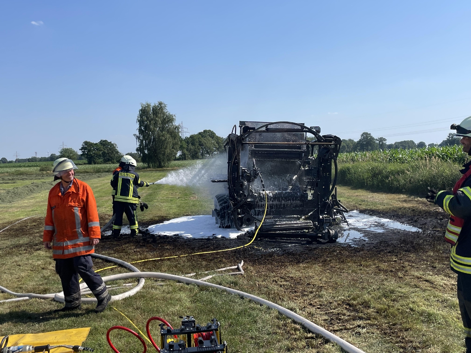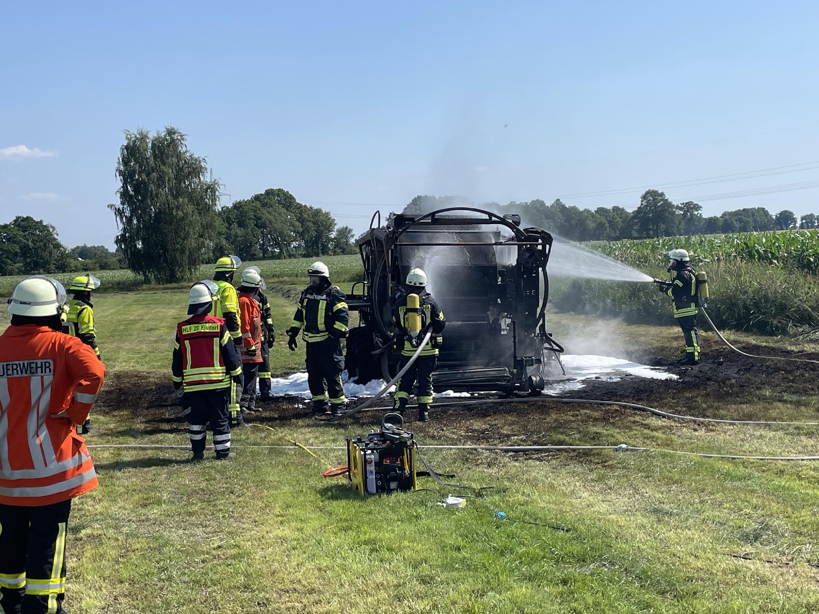 Bei Eintreffen der ersten Einsatzkräfte stand das landwirtschaftliche Gerät bereits in Vollbrand. Die Rauchschwaden waren schon von weiten sichtbar. Umgehend gingen mehrere Trupps unter Atemschutz gegen die Flammen vor. Aufgrund der herrschenden Trockenheit wurden vorsorglich weitere wasserführende Fahrzeuge an die Einsatzstelle alarmiert. Die Einsatzstelle befand sich auf einem Feld, wo Heu lag. Die Feuerwehr hatte die Flammen relativ zügig gelöscht. Die Nachlöscharbeiten zogen sich noch etwas hin, da das Gerät sehr heiß war. Es musste reichlich Wasser eingesetzt werden, um dieses runter zu kühlen.