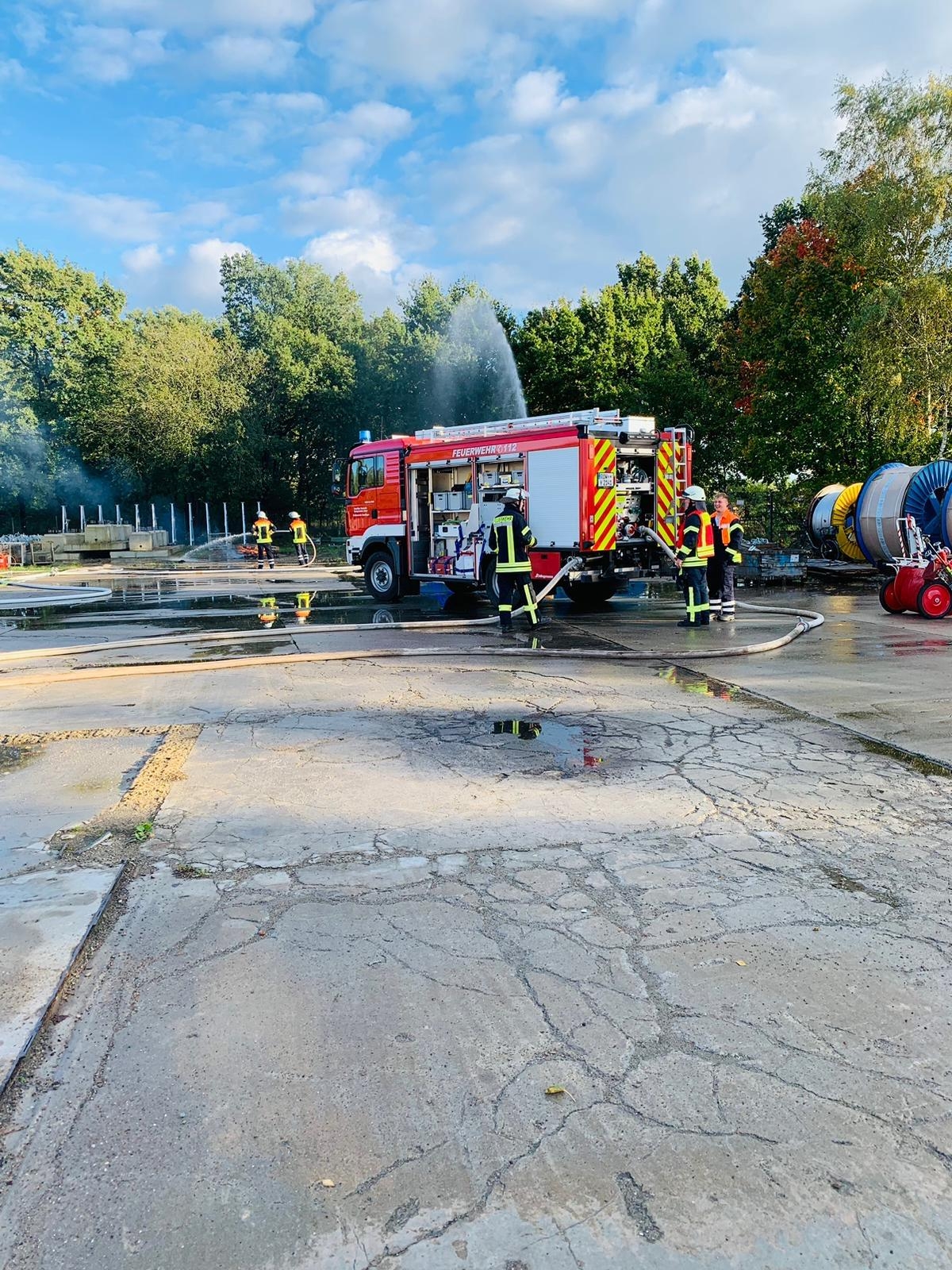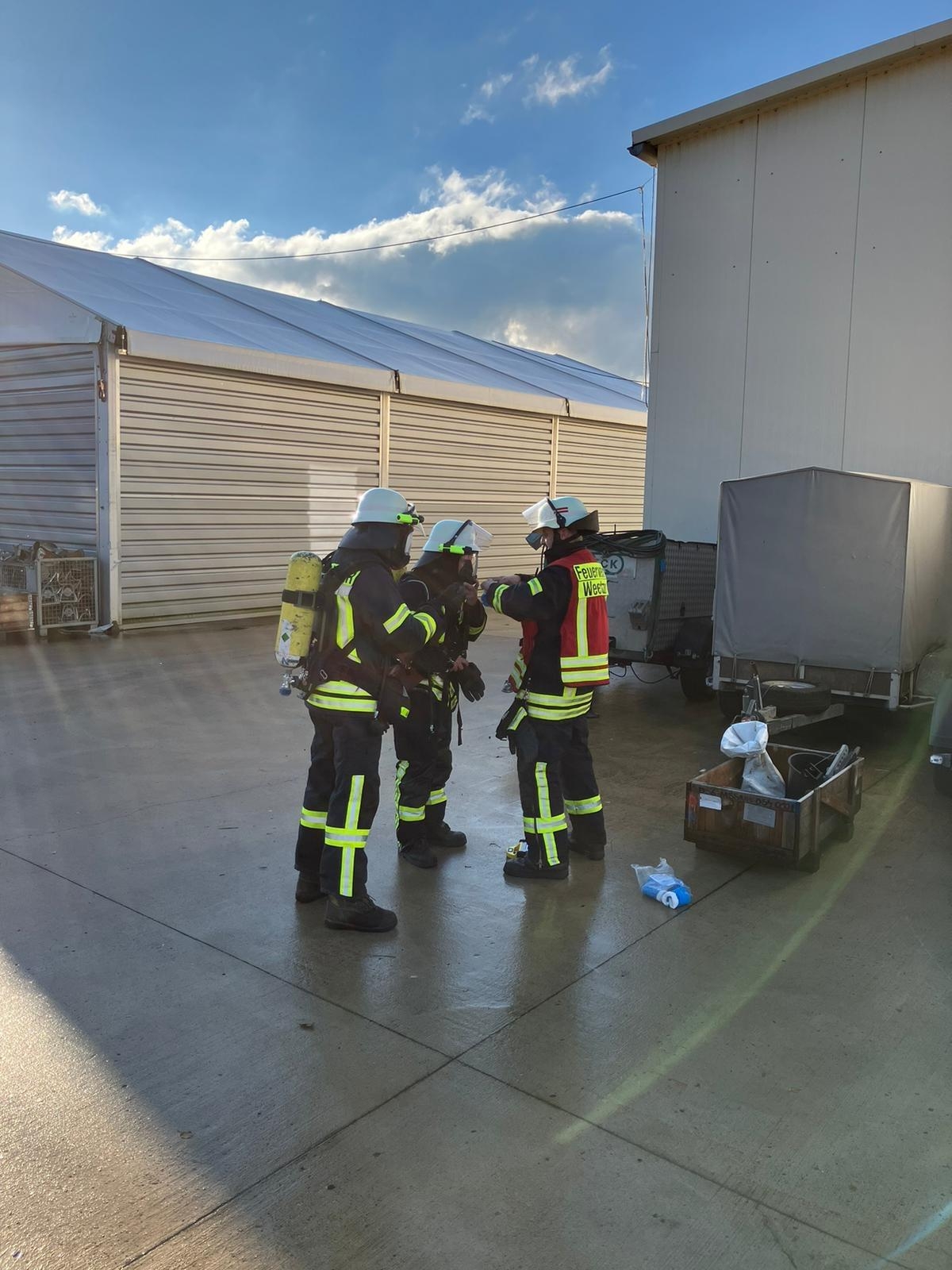 Vorort angekommen wurde durch den Gruppenführer ein Feuer im Außenbereich der Halle erkundet und es wurden innerhalb der Halle vier Personen vermisst. Die Personensuche wurde durch mehrere Trupps unter Atemschutz vorgenommen. Parallel dazu wurde eine Wasserversorgung errichtet und es wurden erste Löschmaßnahmen eingeleitet. Im Übungsverlauf wurden alle Personen aus dem Gebäude gerettet und das Feuer wurde gelöscht.