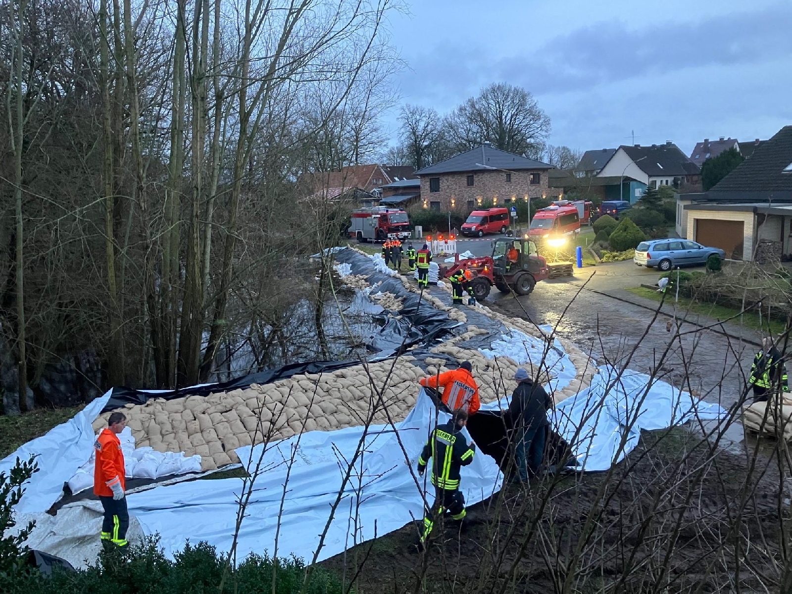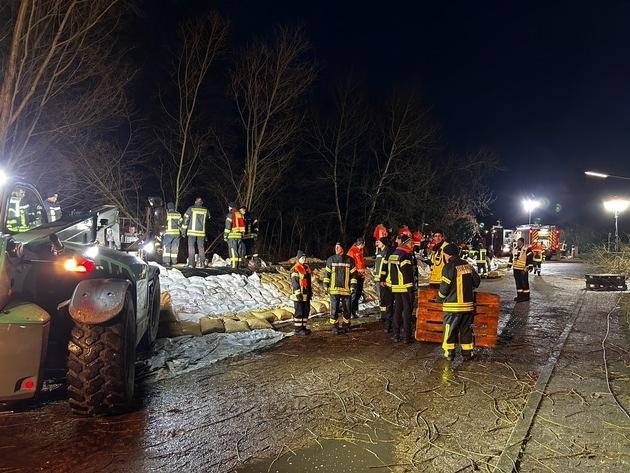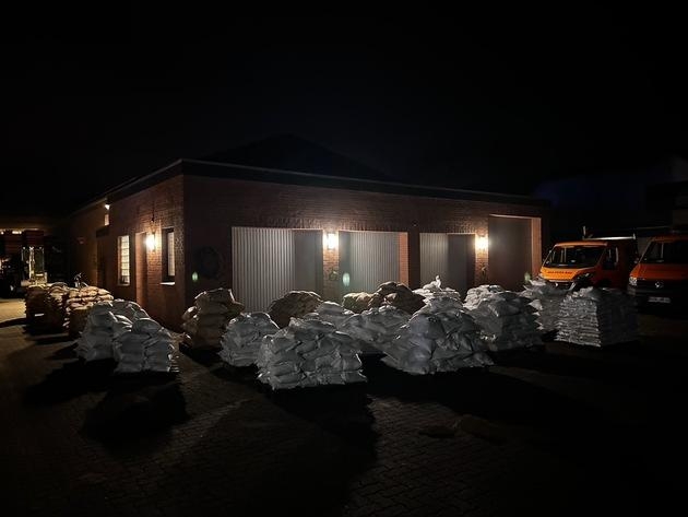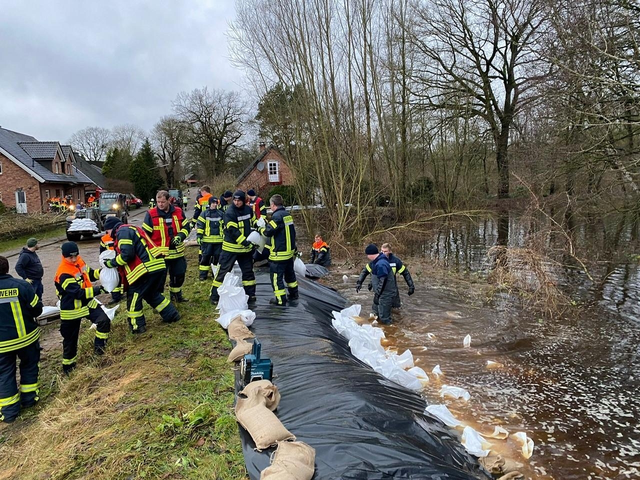 Am Samstag, den 23.12.2023 wurden um 13 Uhr die Feuerwehren aus Brauel und Badenstedt alarmiert um beim Baugeschäft Wülpern in Brauel eine Sandsack-Füllstation auszubauen und zu betreiben. Dort wurden 20.000 Sandsäcke in Standardgröße und einige Hundert weitere in Übergröße durch die Einsatzkräfte befüllt. Außerdem wurden 5 Paletten mit befüllten Sandsäcken von der Füllstation aus Weertzen an die Einsatzstelle nach Brauel transportiert. Um circa 14:15 Uhr wurden dann die Feuerwehren aus Meinstedt und Zeven hinzu alarmiert, um in der Straße "Am Brink" in Brauel den dortigen Deich mit Folie und Sandsäcken zu verstärken. Um dort effektive Maßnahmen durchführen zu können, wurde das Buschwerk am Deich mit Hilfe von Motorsägen und Wathosen zurückgeschnitten, damit die Folie ausgelegt werden konnte und die Sandsäcke positioniert werden konnten. Im weiteren Verlauf des Einsatzes wurden die Feuerwehren Sassenholz, Nartum, Wehldorf, Oldendorf und Wistedt nach Brauel gerufen um die sich bereits im Einsatz befindlichen Einsatzkräfte zu verstärken oder auszulösen. Es waren zeitweise 140 Kräfte vor Ort um die Füllstation zu betreiben, die Säcke zu befördern und um den Deich zu verstärken. Die Einsatzkräfte wurden durch eine Lieferung von Aldi mit Obst und Snacks und durch das Gasthaus "Zur Linde" aus Brauel, welche ein Buffet für die Einsatzkräfte aufgebaut haben, versorgt. Es wurden bis heute 18:15 Uhr über 30 Paletten mit Sandsäcken am Deich verbaut und ein weiteres dutzend Paletten steht fertig befüllt in Brauel bereit. Alle Einsatzkräfte haben die Einsatzstelle um 18:15 Uhr verlassen, aber dennoch wird diese regelmäßig kontrolliert.