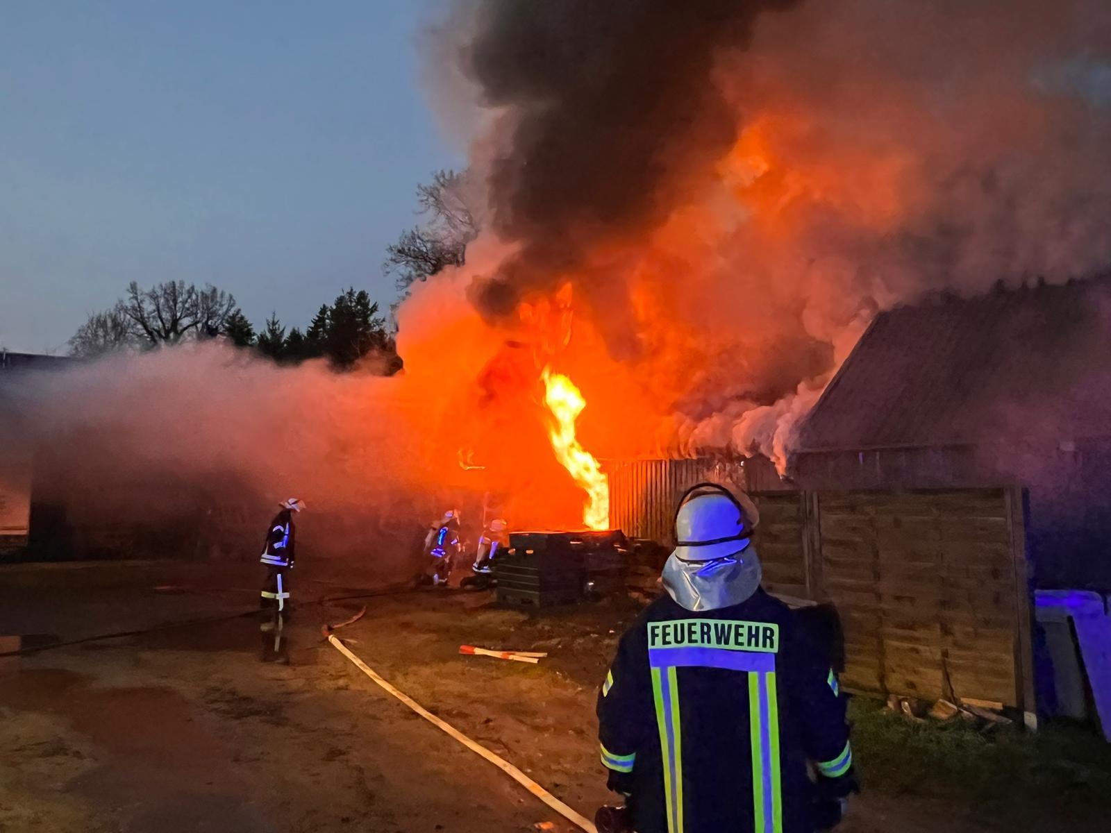 AUf einem landwirtschaftlichen Betrieb ist aus noch ungeklärter Ursache eine Scheune in Brand geraten, in der Scheune lagerten unteranderem auch Düngemittel. Wären bei diesem Einsatz noch Chemikalienschutzanzüge eingesetzt worden, hätten die Atemschutzgeräteträger Löschmaßnahmen unter "Vollschutz" durch führen sollen...