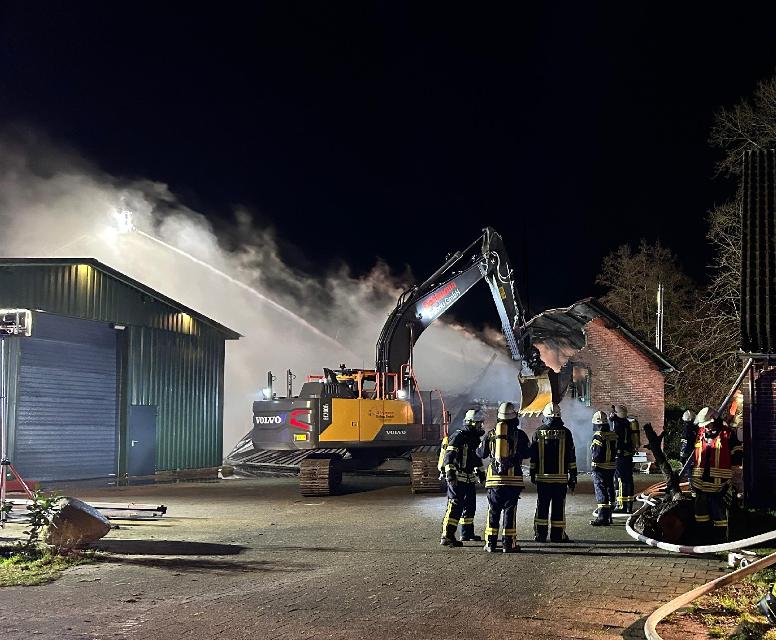 Um sicherzustellen, dass alle Glutnester gelöscht werden und ein erneutes Aufflammen verhindert wird, musste das Gebäude mithilfe eines Baggers abgetragen werden.