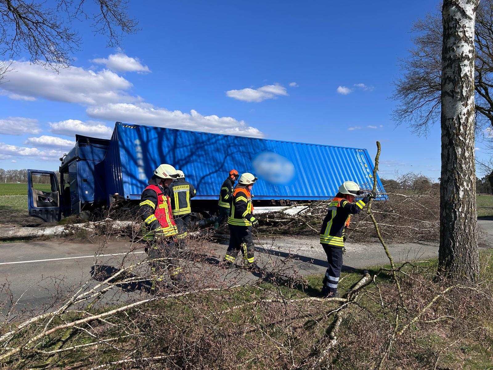Ein LKW kam aus ungeklärter Ursache von der Fahrbahn ab und prallte gegen einen Straßenbaum. Dieser wurde durch den Aufprall vollständig gefällt und versperrte die gesamte Straße. Die Zevener Feuerwehrkräfte überprüften den Kraftstofftank auf Undichtigkeiten. Eine Beschädigung und somit eine Umweltgefährdung konnte nicht festgestellt werden. Außerdem wurde der Baum soweit von der Fahrbahn entfernt, dass Fahrzeuge die Unfallstelle passieren können.