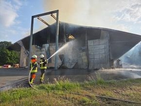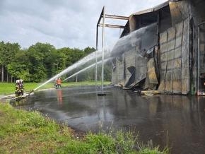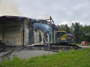 Ein örtlicher Bauunternehmer unterstütze die Einsatzkräfte mit einem Bagger um die Lagerhalle nach Vorgabe des ebenfalls eingesetzten THW aus Rotenburg von der Gebäudehülle zu befreien, damit die letzten Glutnester abgelöscht werden konnten.