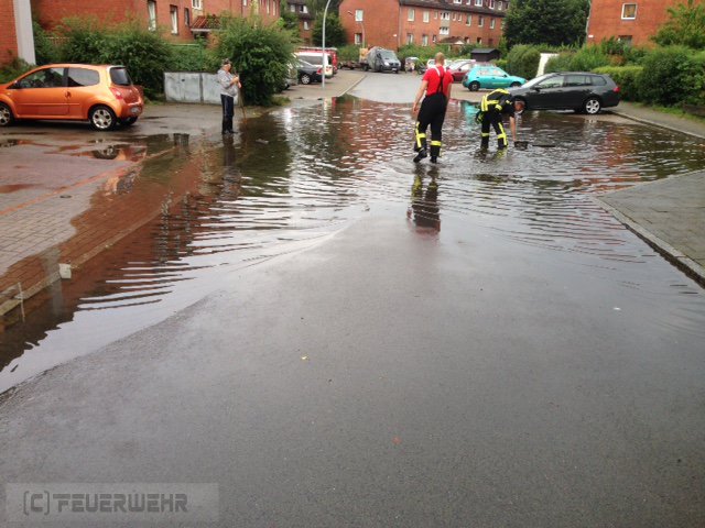 Zeven(tw) Einsatz für die Ortsfeuerwehr Zeven am 15.08.15 um 09:38 Uhr zu einer Technischen Hilfeleistung in die Breslauer Straße, hier lief das Oberflächenwasser nach kurzen aber heftigen Regenschauer (bis zu 35l pro m²) nicht ab. Als erstes wurden die Gullieinläufe geöffnet und die Einsatzstelle abgesichert. Im weitern Einsatzverlauf wurde der Bauhof Zeven nachgefordert, der mittels Spülwagen das Kanalnetz frei spülen sollte um den Abfluß des Oberflächenwasser zu gewährleisten.