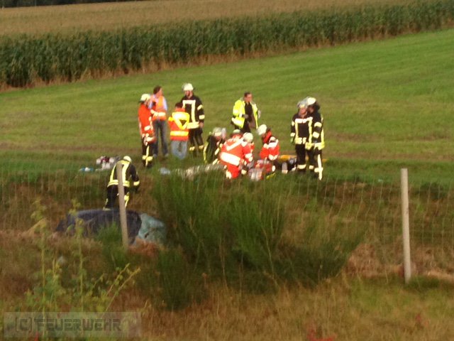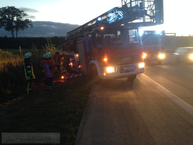 Elsdorf(tw) Alarm für die Ortsfeuerwehren aus Elsdorf und Zeven sowie dem Rettungsdienst aus Zeven zu einem schwerden Verkehrsunfall auf der Autobahn A1 in Fahrtrichtung Hamburg bei Kilometer 65,5 am 27.09.15 um 18.54 Uhr. Laut ersten Meldungen sollte eine Person in dem verunfallten PKW eingeklemmt sein. Kurz vor Ausfahrt des ersten Fahrzeuges kam auf die DME die Meldung A-B-S-P-A-N-N-E-N laut Autobahnpolizei keine Person mehr im Fahrzeug eingeklemmt. Kurze Zeit später wurden die DME erneut ausgelöst, es wird jetzt doch die Feuerwehr zur technischen Rettung benötigt. Da das Fahrzeug von der Fahrbahn abgekommen war,einen Wildschutzzaun durchbrochen hat und in einem Entwässerungsgraben zum liegen gekommen ist und die Person durch Ersthelfer befreit worden ist, aber allerdings auf einer Wiese gelegen hat, musste die Person mittels Drehleiter von der Wiese zurück auf die Autobahn geholt werden. Nachdem die Person an den Rettungsdienst übergeben worden ist, wurde noch eine Ölsperre gesetzt und auslaufende Betriebsstoffe gebunden.