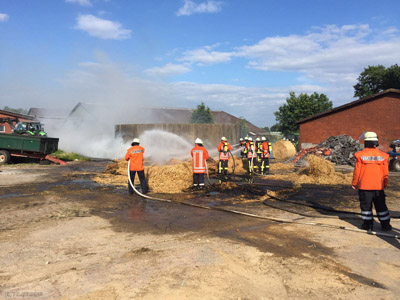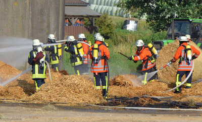 Glück im Unglück hatte heute am späten Nachmittag ein Landwirt aus Westertimke. Aus noch unbekannter Ursache fingen kurz nach 17 Uhr mehrere auf einem Anhänger gelagerte Rundballen Feuer. Dem Landwirt gelang es noch, mit einem Trecker die Ballen von dem Hänger zu bugsieren. Die Feuerwehr, die mit rund 70 Kameraden der Ortswehren Westertimke, Hepstedt, Tarmstedt, Kirchtimke, Ostertimke und Wilstedt angerückt war, verhinderte anschließend ein Übergreifen der Flammen auf die benachbarten Nebengebäude. Die zunächst aus Zeven angeforderte Drehleiter konnte wieder abdrehen, nachdem das glücklicherweise geringere Ausmaß des Brandes festgestellt worden war. "Das hätte weitaus schlimmer ausfallen können, gerade bei dem Wind", so die Einschätzung eines beteiligten Feuerwehrmannes, der erleichtert war, dass sich der "Brand eines Strohlagers" als harmloser herausstellte als zunächst erwartet.