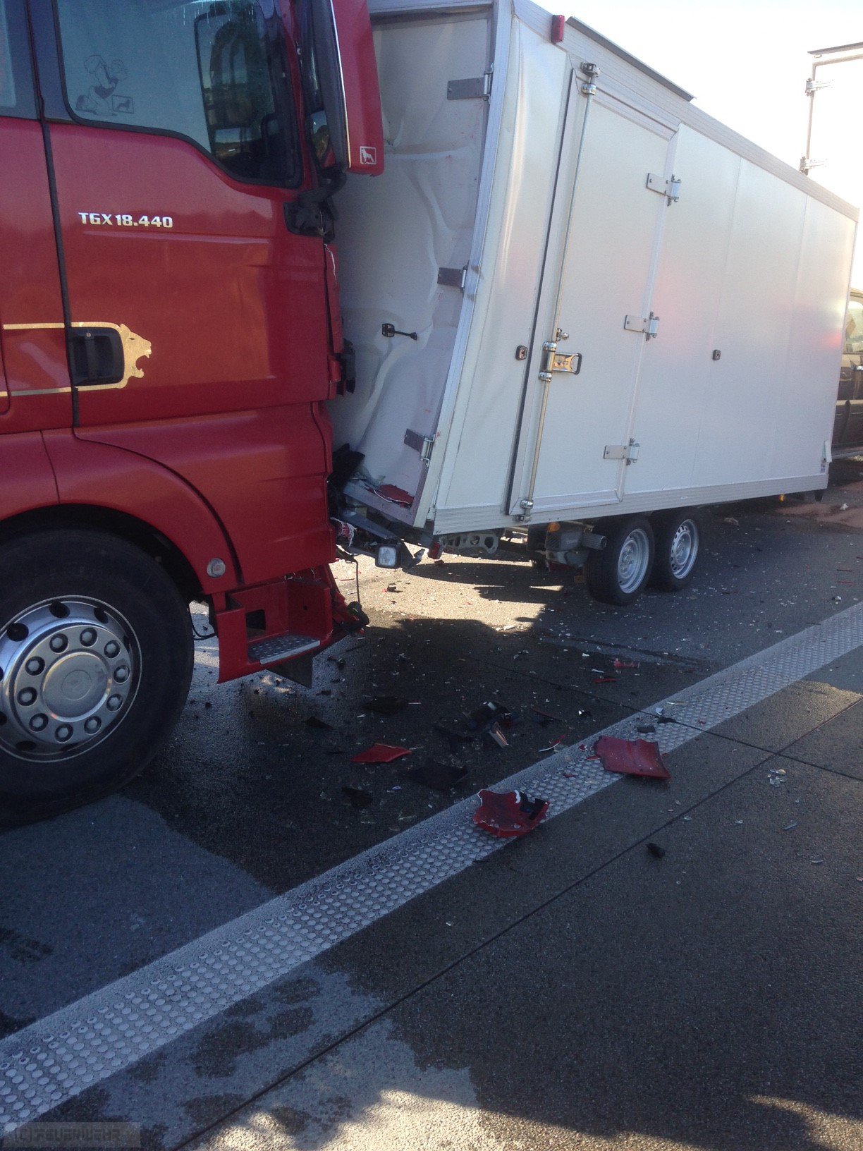 Am Stauende kam es gegen 08.15 h zu einem weiteren Unfall zwischen den Anschlussstellen Stuckenborstel und Bockel. Ein Sattelzug aus Duisburg konnte am Ende des Staus sein Fahrzeug nicht rechtzeitig zum Stehen bringen und schob einen stehenden Mitsubishi Pajero mit Anhänger auf einen ebenfalls stehenden LKW auf. Der Fahrzeugführer des Sattelzuges sowie der Führer des Mitsubishi kamen verletzt ins Krankenhaus.