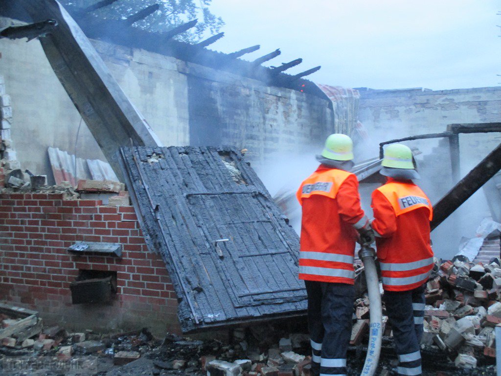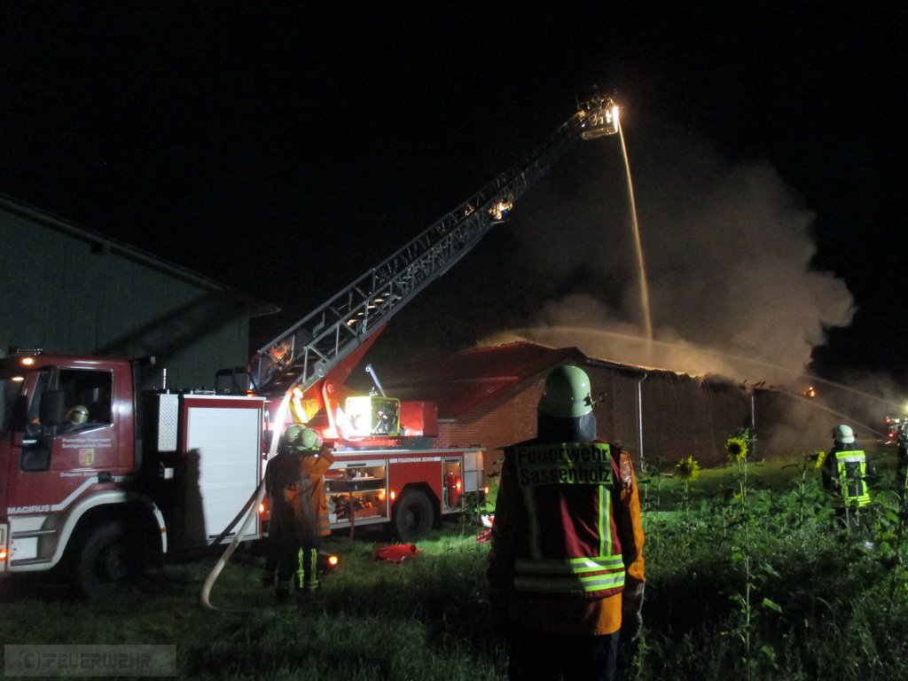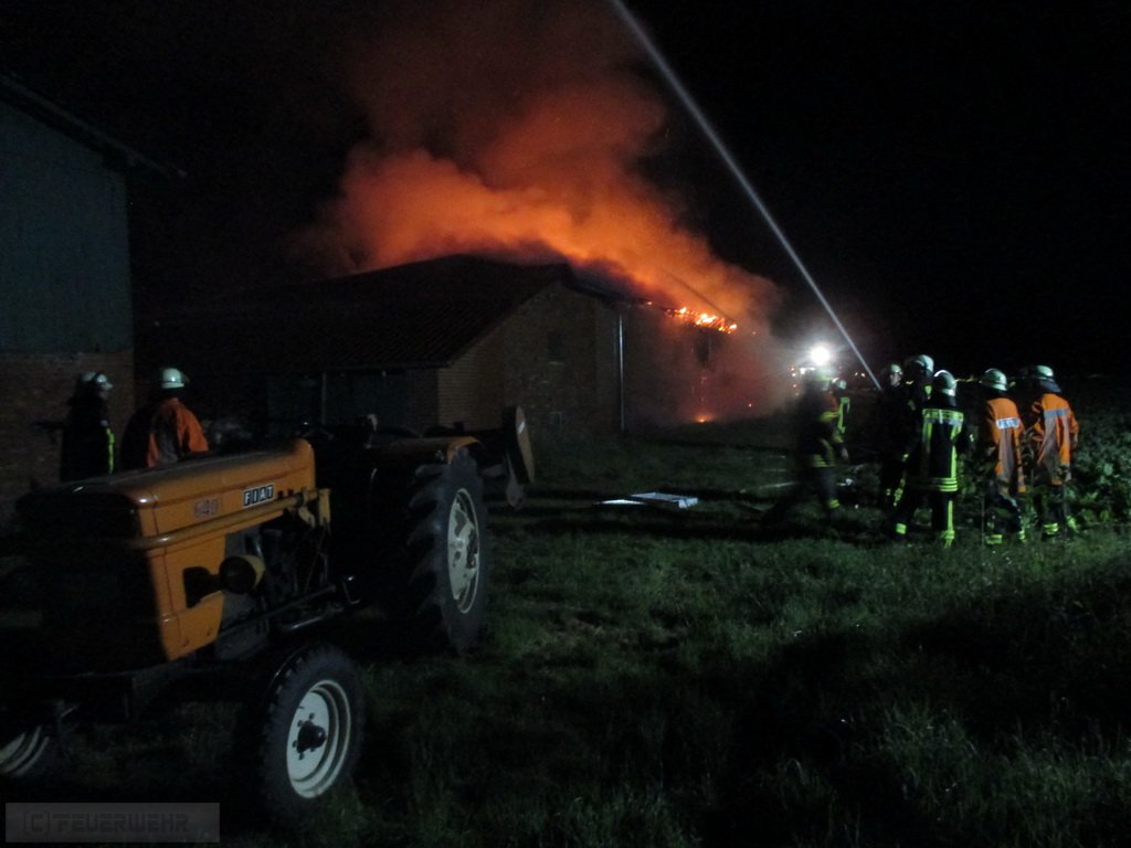 Bei Eintreffen der ersten Kräfte schlugen bereits Flammen aus dem Keller einer Scheune. Rasend schnell erfolgte die Durchzündung der rund 20 mal 40 Meter großen Scheune. Sofort stand Sie in Vollbrand. Ein Innenangriff war daher nicht mehr möglich. Umgehend musste das Alarmstichwort auf „Feuer groß“ erhöht werden. Die Wehren Wense, Sassenholz, Zeven und Boitzen rückten ebenfalls zur Einsatzstelle aus. Zwischenzeitlich drohten die Flammen, auf weitere angrenzenden Scheunen und das Wohnhaus überzugreifen. Dies konnte glücklicherweise durch das rasche Eingreifen der Feuerwehren verhindert werden. Mit mehreren C- und B Rohren sowie einem Wenderohr der Drehleiter gingen die Einsatzkräfte teilweise unter Atemschutz gegen das Feuer vor. Zwei Gasflaschen sind ebenfalls explodiert. Im weiteren Verlauf musste mit einem Radlader das Dach abgetragen und einige Mauern eingerissen werden, um an versteckte Glutnester zu kommen. Es loderten immer wieder Flammen auf.