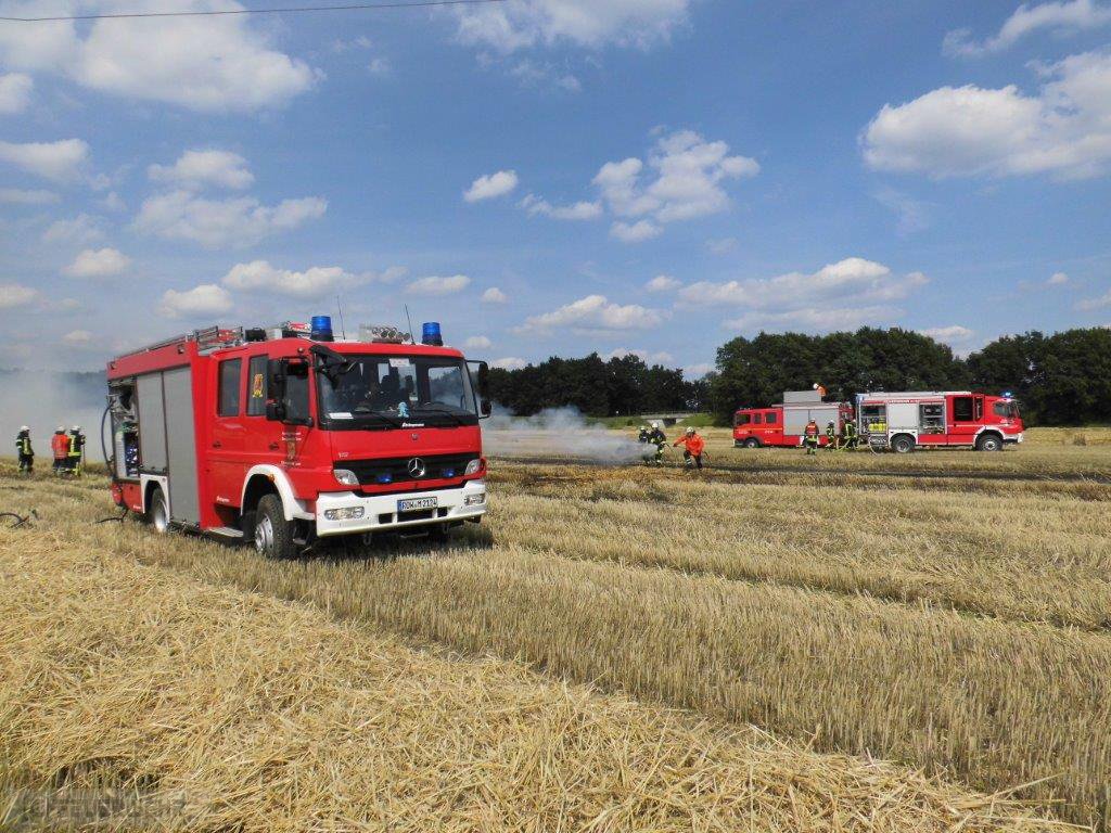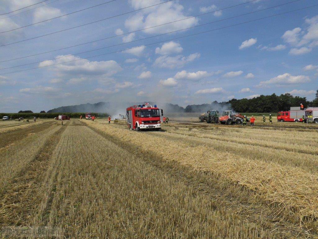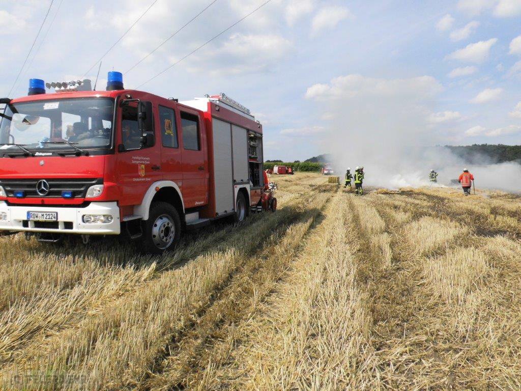 Eitzte(tw) Die Ortsfeuerwehr Zeven wurde mit ihrem Löschgruppenfahrzeug 20/16 zur Unterstützung der eingesetzten Kräfte nach Lavenstedt-Eitzte nachgefordert. Während Erntearbeiten fing eine Strohpresse plötzlich Feuer, das Feuer hat sich aufgrund der trockenheit ausgebreitet.