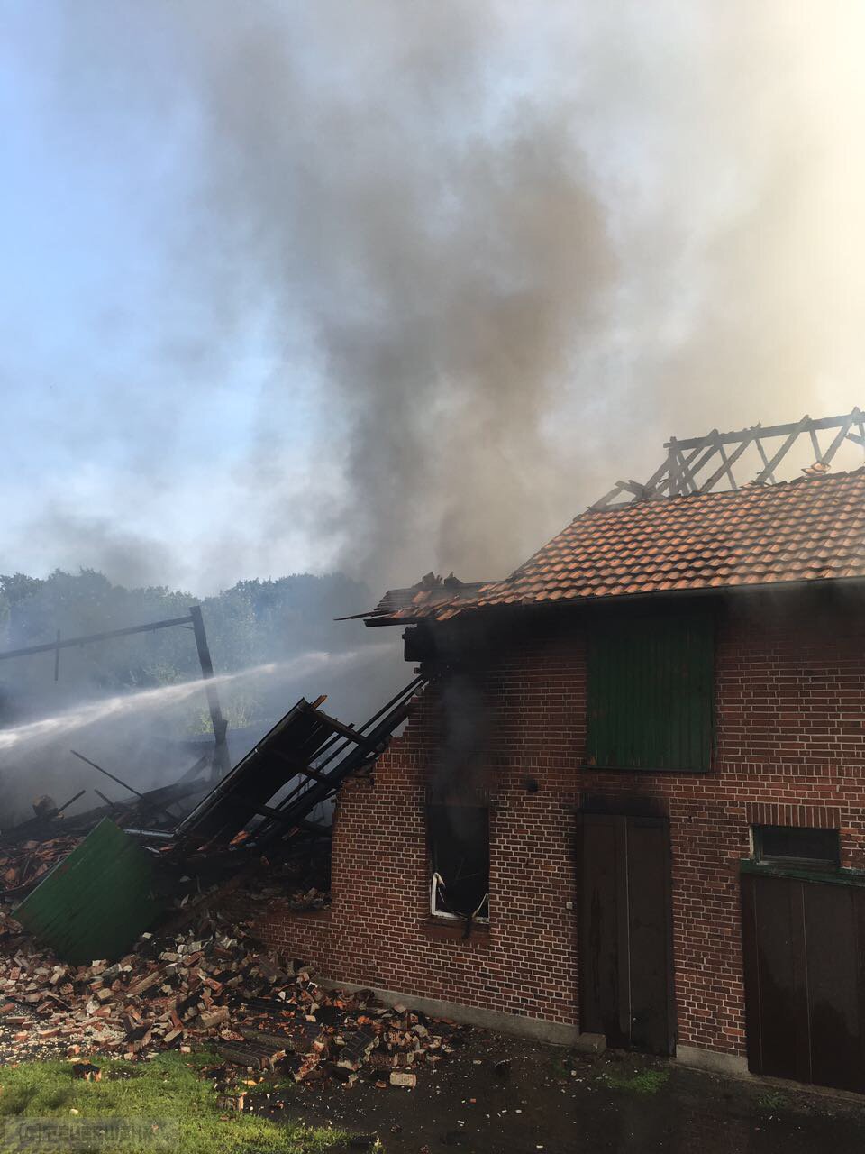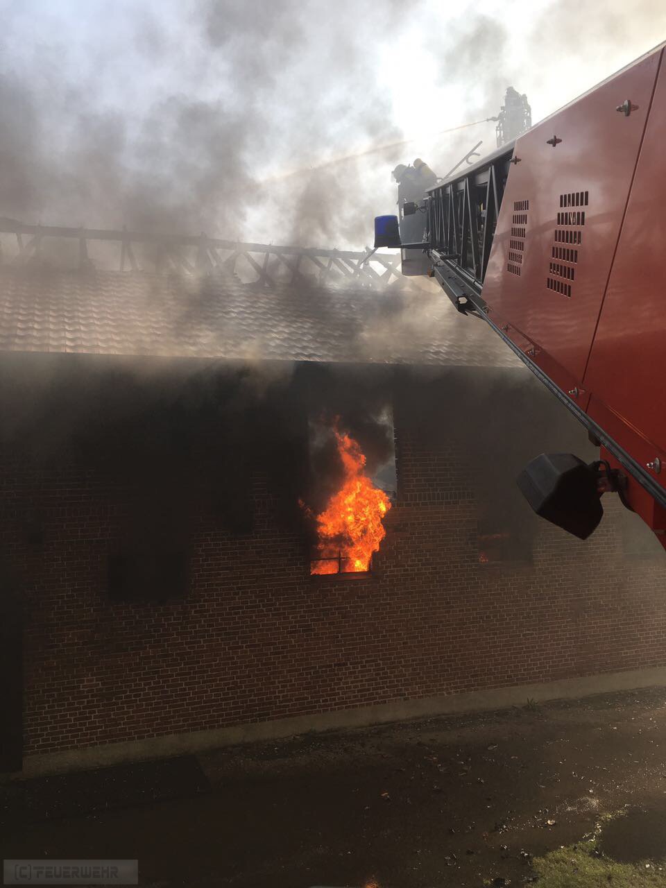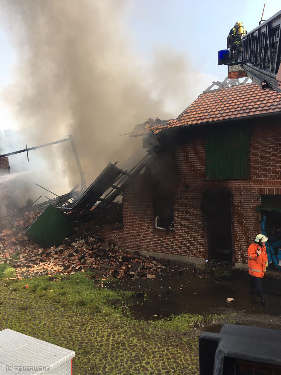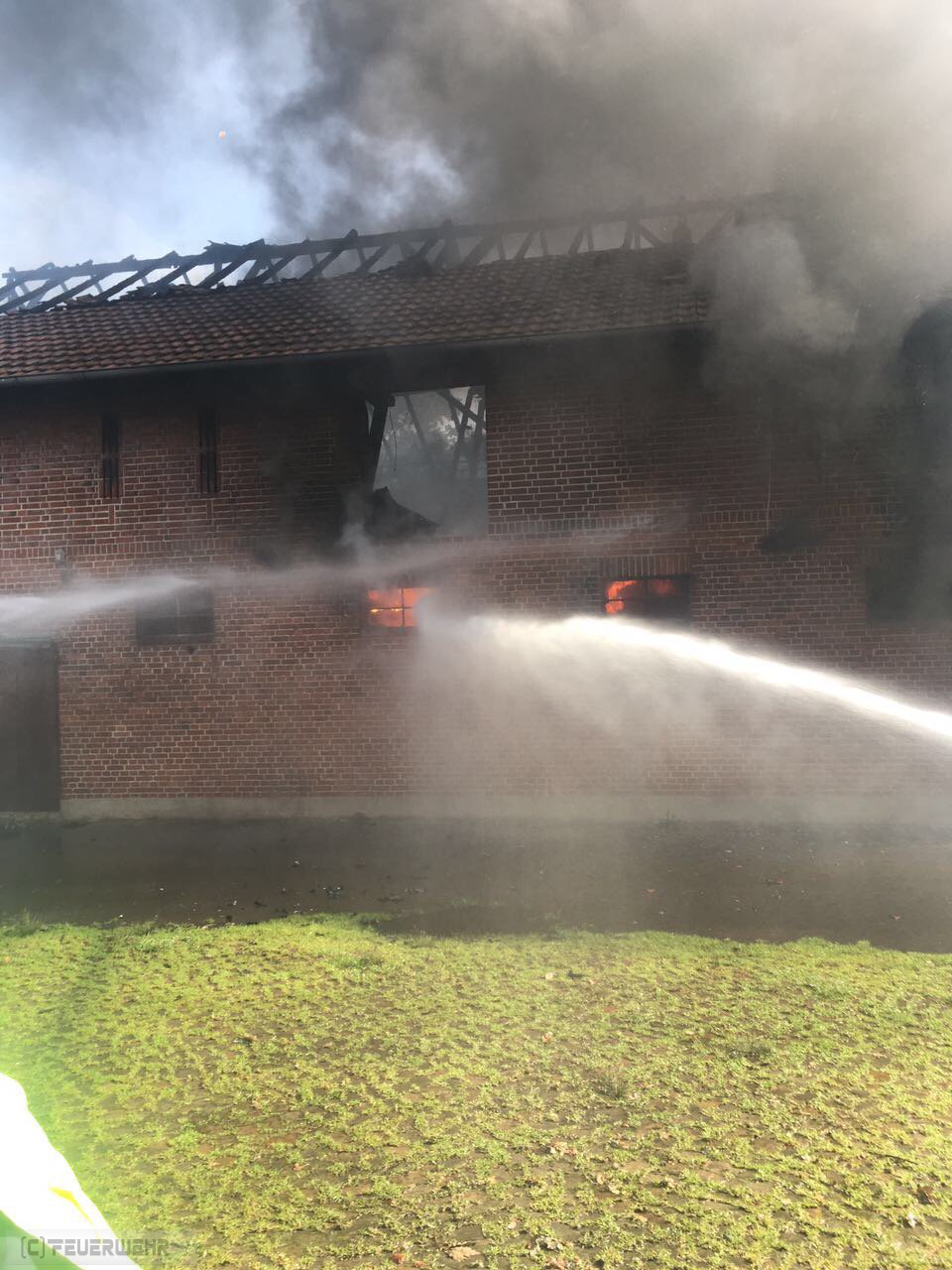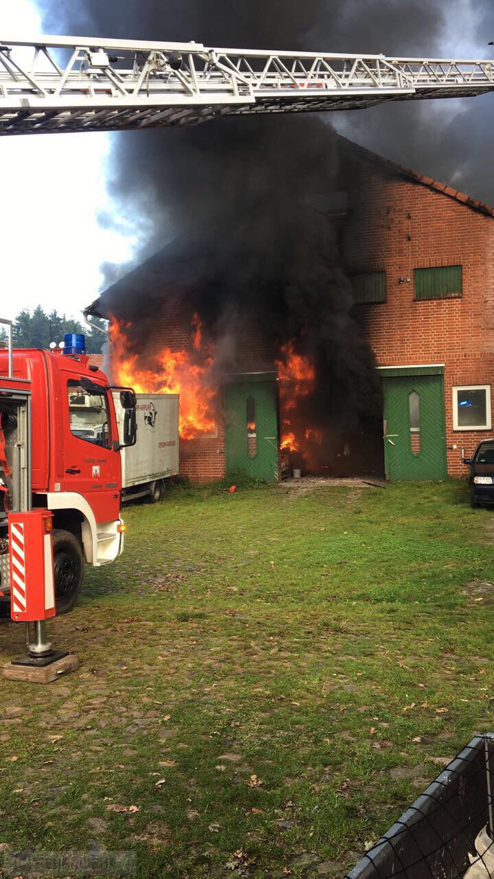 Dabei fing alles ganz harmlos an. Ein Mechaniker hatte in einer Autowerkstatt gerade etwas gebohrt, und sich danach kurz abgewendet. Als er sich wieder umdrehte brannte es in der Werkstatt. Er versuchte noch mit zwei Feuerlöschern den Brand zu löschen, doch das mißlang und rief dann die Feuerwehr. Das Feuer breitete sich dann sehr schnell aus und griff auf eine große ehemalige Scheune über, in der auch Autos untergebracht waren. Als die ersten Kräfte nur fünf Minuten nach der Alarmierung eintrefen, war ein Teil der Scheune bereits ausgebrannt und in sich zusammen gestürzt. Flammen loderten aus dem Dach und eine dichte schwarze Rauchwolke war schon von weitem zu sehen. Im Inneren des Gebäude knallte es immer wieder, als Gasflaschen, Spraydosen Reifen explodierten, ein Innenangriff war so nicht mehr möglich. Die Feuerwehr musste kilometerlange Schlauchleitungen auslegen und Unmengen an Wasser heran schaffen. Mit zwei Drehleitern und rund 60 Atemschutzkräften wurde dann von allen Seiten versucht, das Großfeuer unter Kontrolle zu bringen. Das Gebäude mit samt den ganzen dort abgestellten Fahrzeugen brannte jedoch komplett aus. Der Einsatz dauerte bis in den späten Nachmittag. Die Ermittlungen zur genauen Brandursache dauern an.