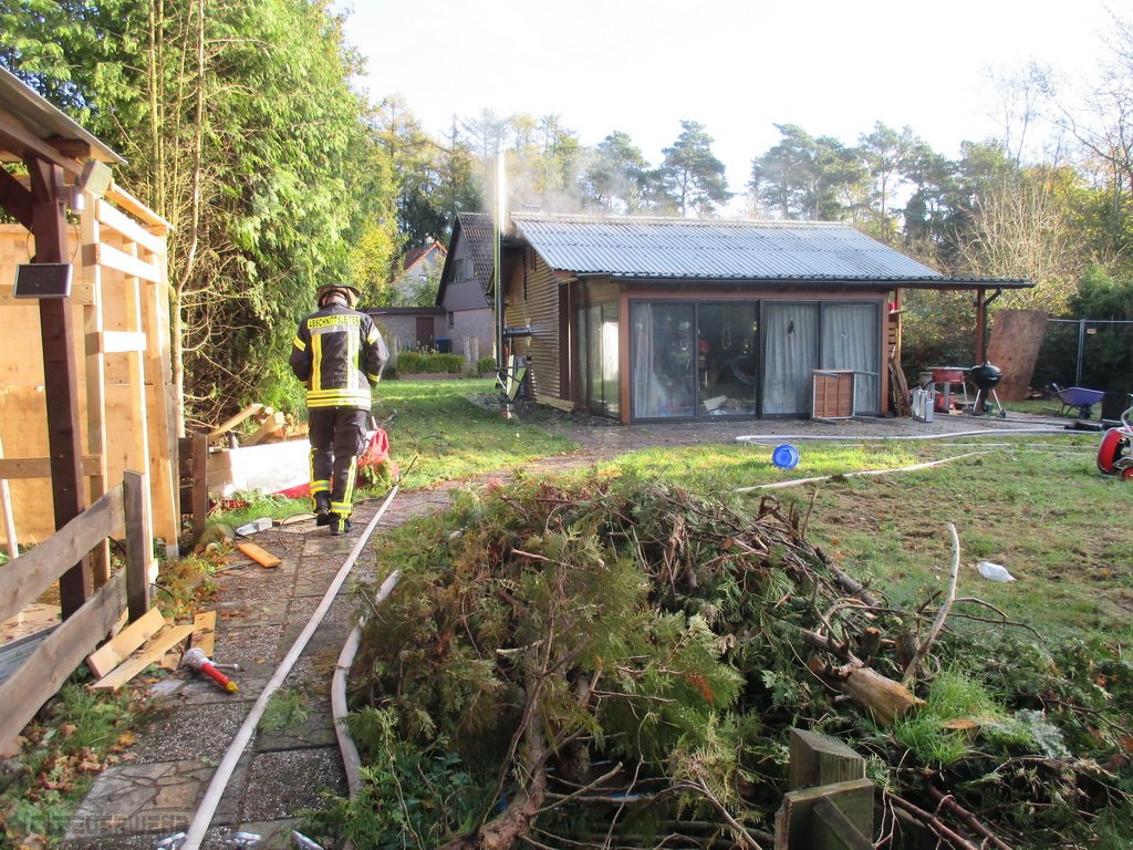 Aus ungeklärter Ursache war in einem Wochenendgebiet ein Wohnhaus in Brand geraten. Bei Eintreffen hatte sich das Feuer bereits durch die Außenwände durchgefressen. Da es sich um ein Holz Haus handelte, war Eile geboten. Mehrere Trupps unter Atemschutz hatten mit C-Rohren die Brandbekämpfung eingeleitet. Glücklicherweise waren keine Personen mehr im Gebäude. Durch das schnelle Eingreifen der Feuerwehrleute konnte ein Vollbrand des Hauses verhindert werden. Mit der Wärmebildkamera der Zevener Feuerwehr musste die Brandstelle abschließend kontrolliert werden. Damit keine versteckten Glutnester das Feuer erneut entfachen.